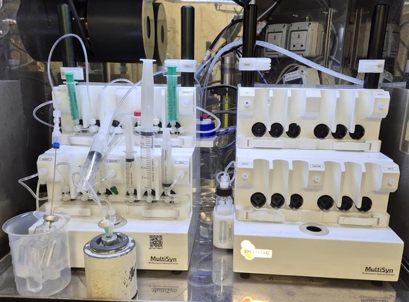 Within this configuration, the first MultiSyn module is dedicated to the purification of cyclotron produced Gallium 68, ensuring a high purity radionuclide input. The purified Gallium 68 is subsequently transferred to the second MultiSyn module for fully automated radiolabelling of a broad range of precursors, including peptides and other biomolecules.