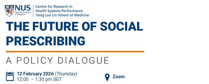 NUS Centre for Research in Health Systems Performance (CRiHSP) is hosting an online Policy Dialogue on 12 February 2026 at 12:00 – 1:30 PM (GMT +8). “The Future of Social Prescribing – A Policy Dialogue” brings together international experts, decision-makers and community providers to discuss the future of social prescribing in Singapore and abroad. This policy dialogue will also build upon CRiHSP’s policy dialogue on social prescribing that was held in 2024, and will also serve as the launch for CRiHSP’s inaugural Policy Brief on social prescribing.