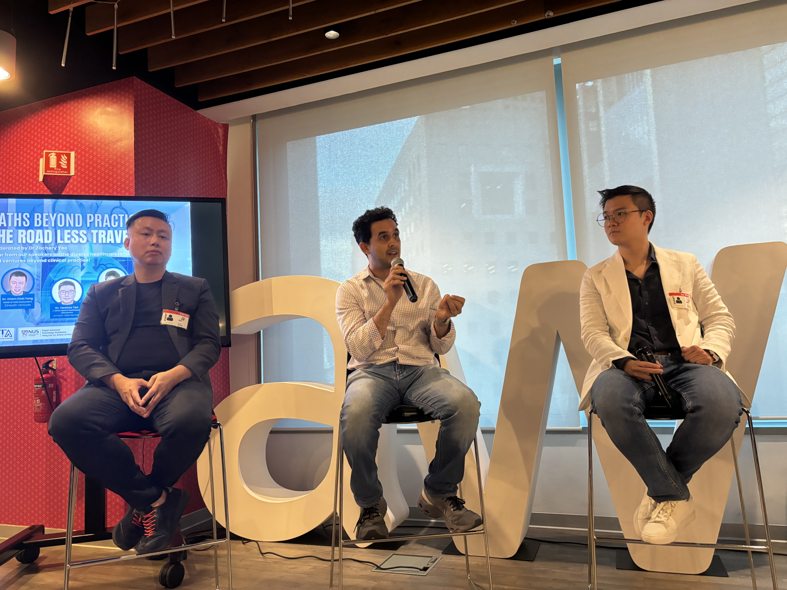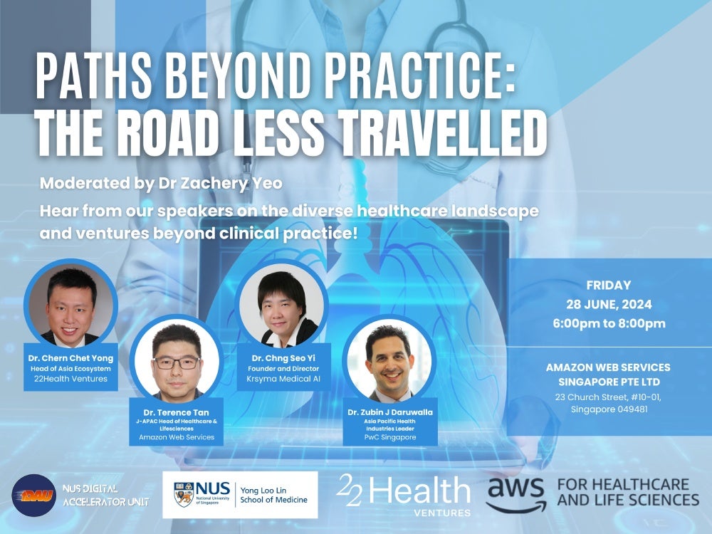 The NUS Medicine Digital Advanced Technology Accelerator (DATA), Amazon Web Services, and 22Health Ventures convened healthcare professionals who transitioned from clinical practice into healthcare investment, technology leadership, and strategic consulting. The panel explored a question many clinicians privately ask: what opportunities exist beyond traditional practice, and how does one successfully navigate the transition?