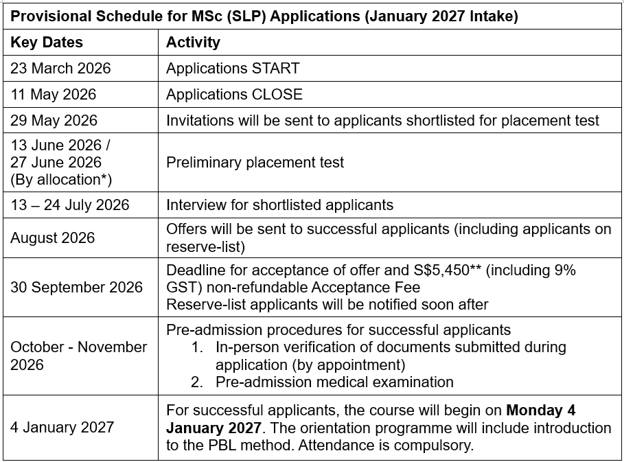 Selection tests and interviews are held in-person at NUS campus for Faculty members to gain a better understanding of the candidates. Overseas applicants are required to arrange travel and accommodation at their own expense. There will be no special arrangements to conduct the sessions over remote platforms. Shortlisted candidates who are absent for any part of the assessment will not be considered for admission to the MSc(SLP) programme.