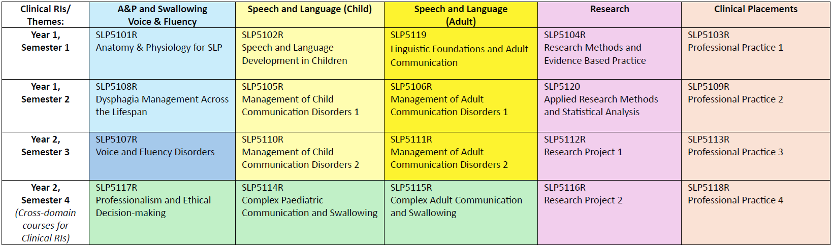 The table below shows the courses organized around clinical range indicators (RIs) and relevant themes. Columns show progression of learning within domains, culminating in integration across domains by Semester 4. All courses are compulsory for qualification to entry-level standards required of Speech and Language Therapists in Singapore.