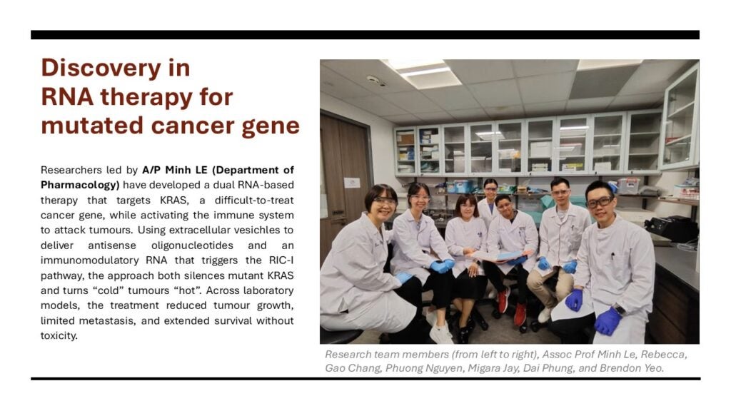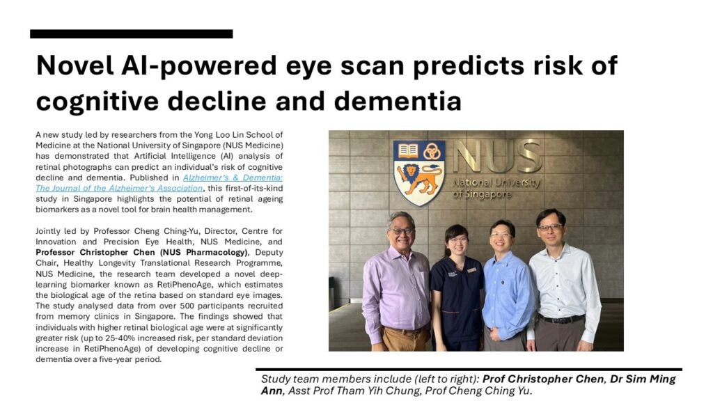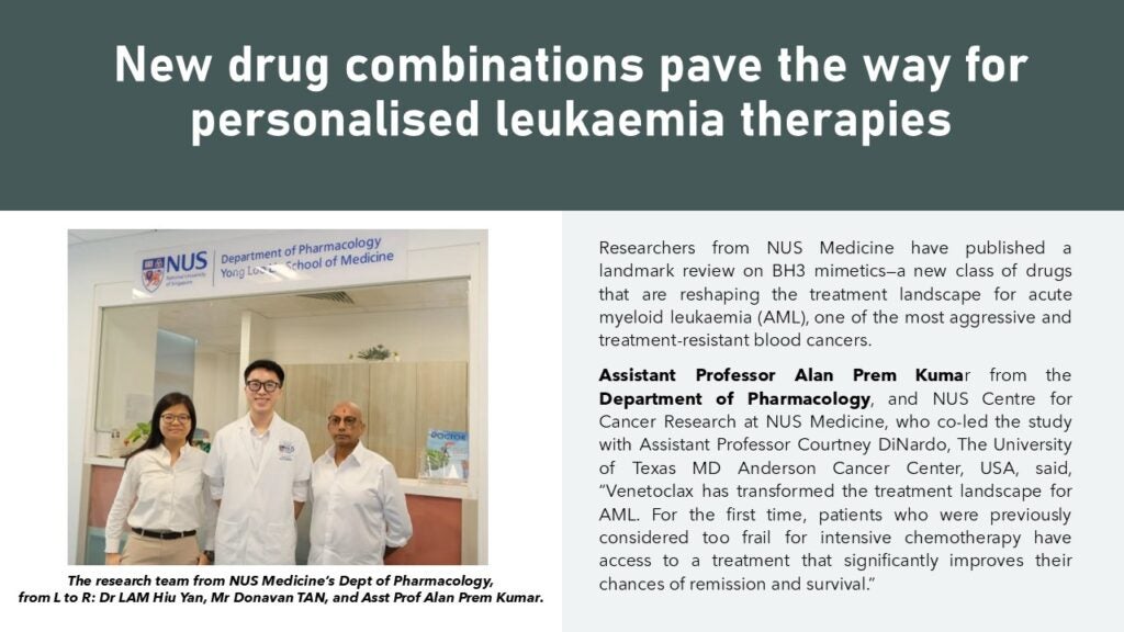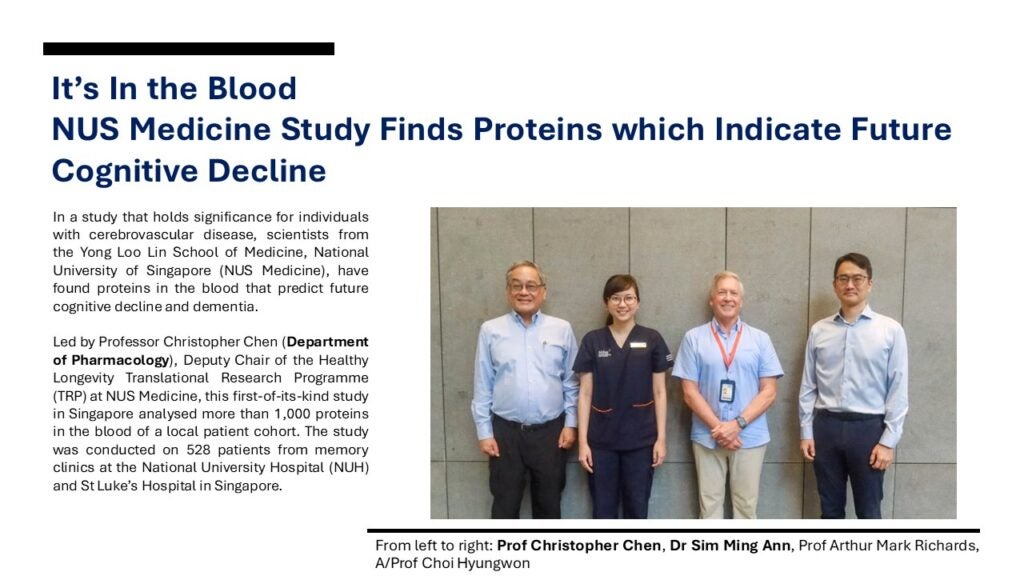 News & Events Dec 2 2025 New Book: Organoids – Advancements in Drug Discovery and Precision Medicine Read more Nov 26 2025 Discovery in RNA therapy for mutated cancer gene Read more Nov 19 2025 A/P Judy SNG delivered keynote speech at Internal Medicine Summit 2025 Read more Nov 13 2025 Asia-Pacific In-house IP Leader of the Year 2025: Dr. Eugene HO Read more Nov 10 2025 Can biohacking rewrite the human operating system? (ft. Professor Dean HO) Read more Nov 3 2025 It’s In the Blood: NUS Medicine Study Finds Proteins which Indicate Future Cognitive Decline Read more Oct 29 2025 Team NUS (Staff) Secures 3rd Place at Public Service 9-Pin Tap Bowling Tournament Read more Oct 23 2025 New drug combinations pave the way for personalised leukaemia therapies Read more Oct 10 2025 Mass Spectrometry Workshop Read more Sep 26 2025 Top 2% Scientist In the World 2025 Read more Sep 18 2025 Novel AI-powered eye scan predicts risk of cognitive decline and dementia Read more Sep 2 2025 The Grant Awardees of the Singapore – New Zealand Joint Grant Call for Leveraging AI for Healthy Ageing: Dr. Hilal Saima Read more 1 2 3 … 16 Next »