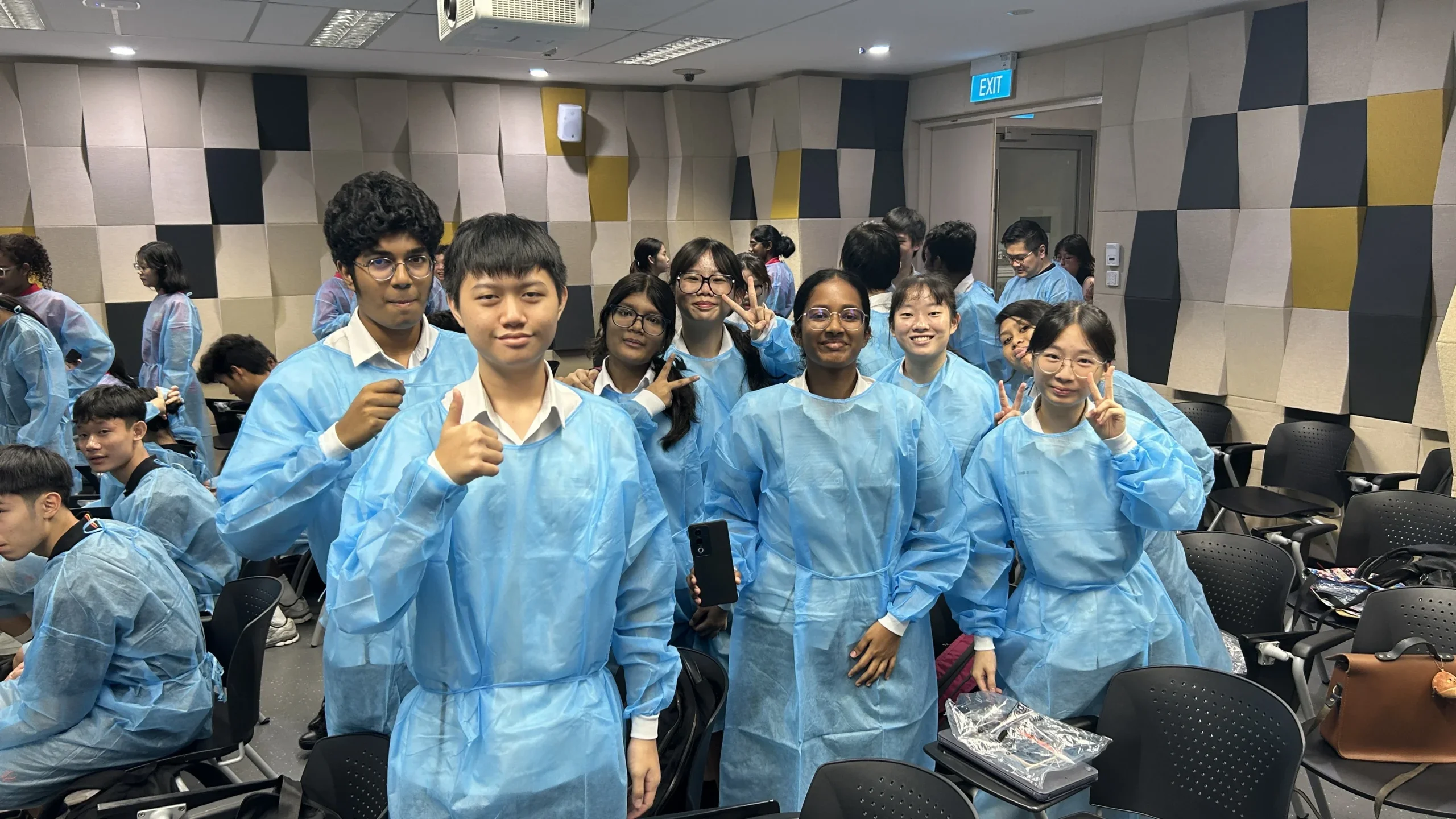 Participants from Manjusri Secondary School gowning up in PPE before beginning their Learning Journey