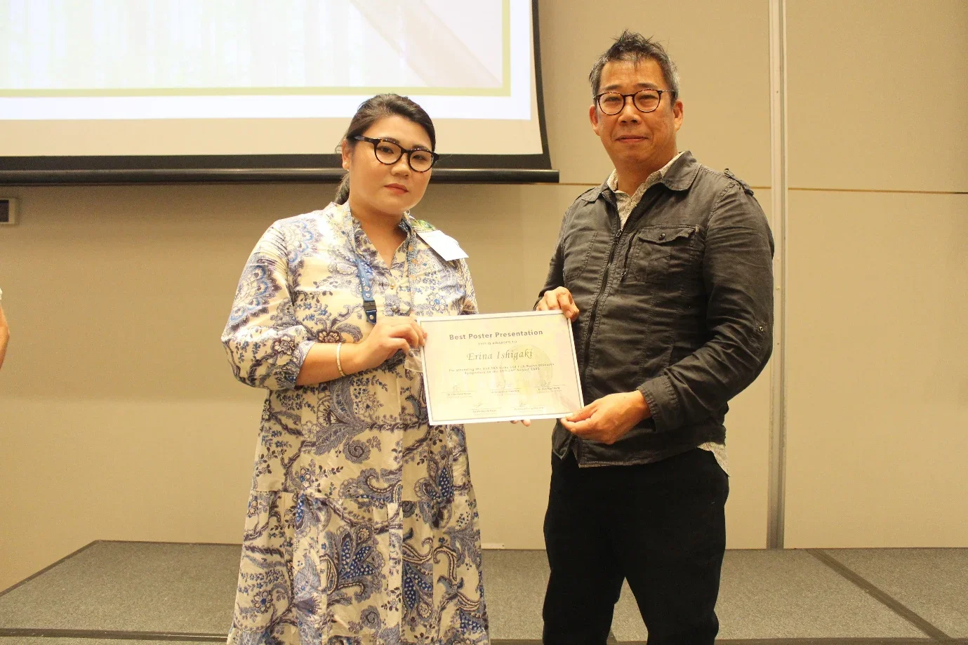 Erina Ishigaki from Nagasaki University (left) receiving the Best Poster Award from Dr. Benjamin Lee, a member of the symposium scientific committee.