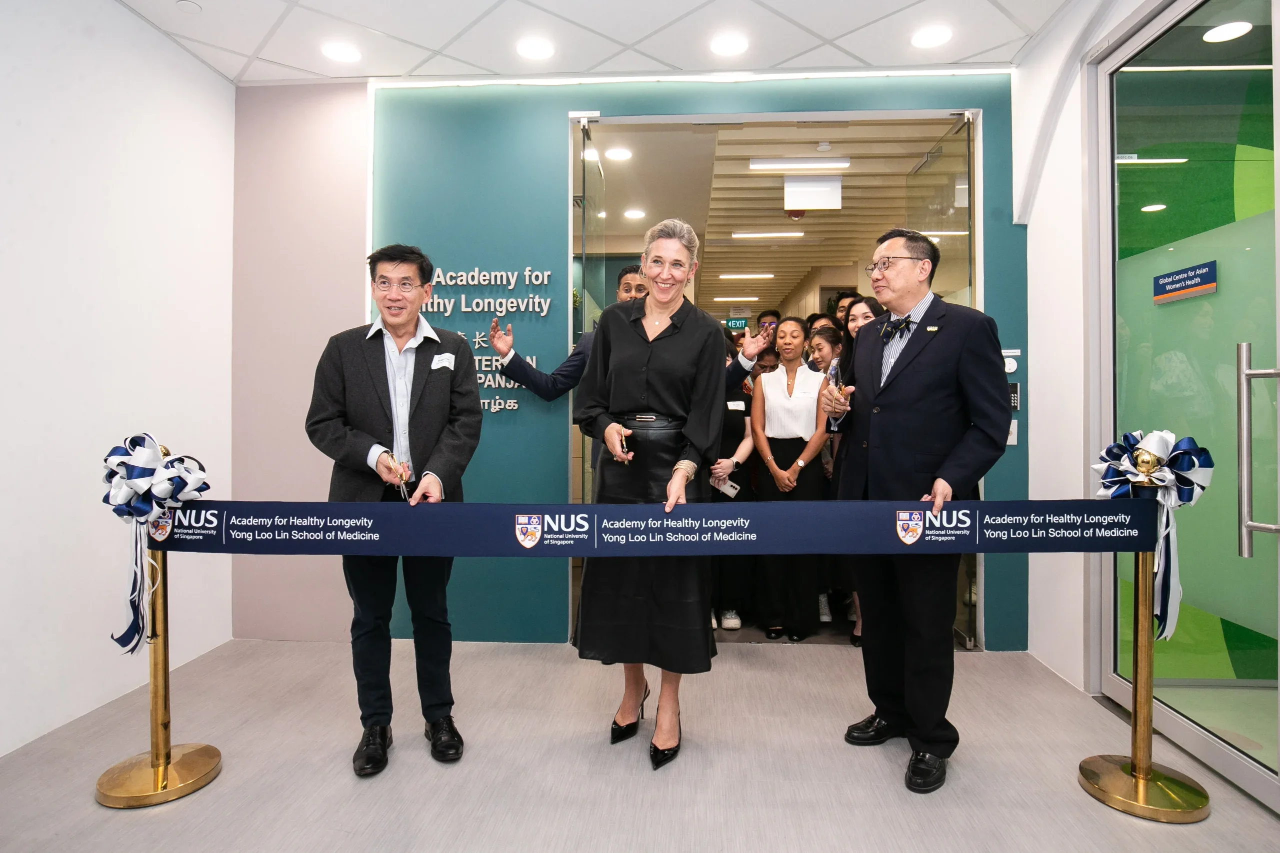 Ribbon cutting ceremony, from L to R: Prof Roger Foo, Vice-Dean (Research), NUS Medicine, Prof Andrea Maier, Director, Academy for Healthy Longevity, and Prof Chong Yap Seng, Dean, NUS Medicine.
