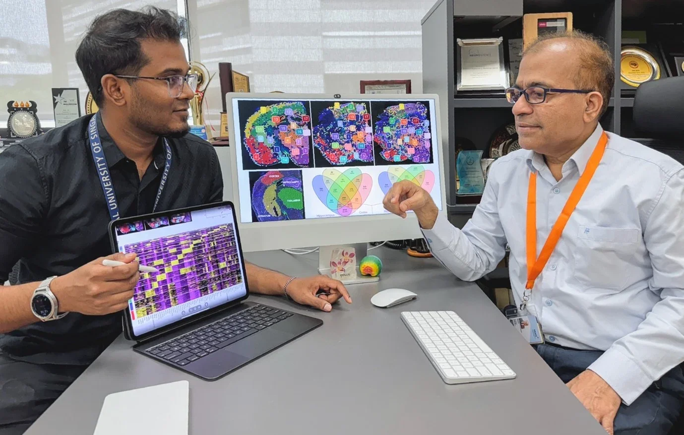 Prof S T Dheen (right) and Dr Kevin Jayaraj (left) review spatial transcriptomics data derived from the laboratory models.