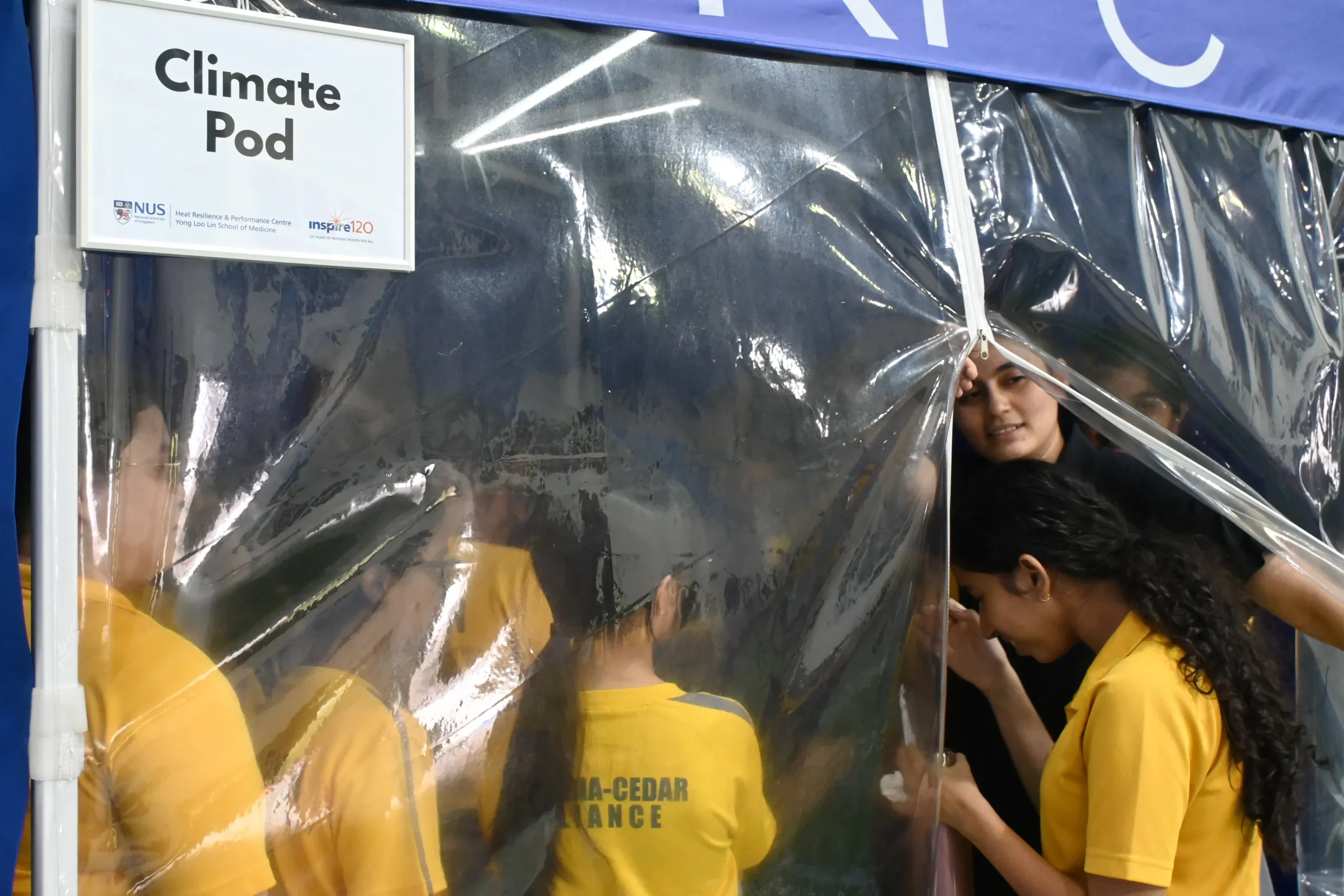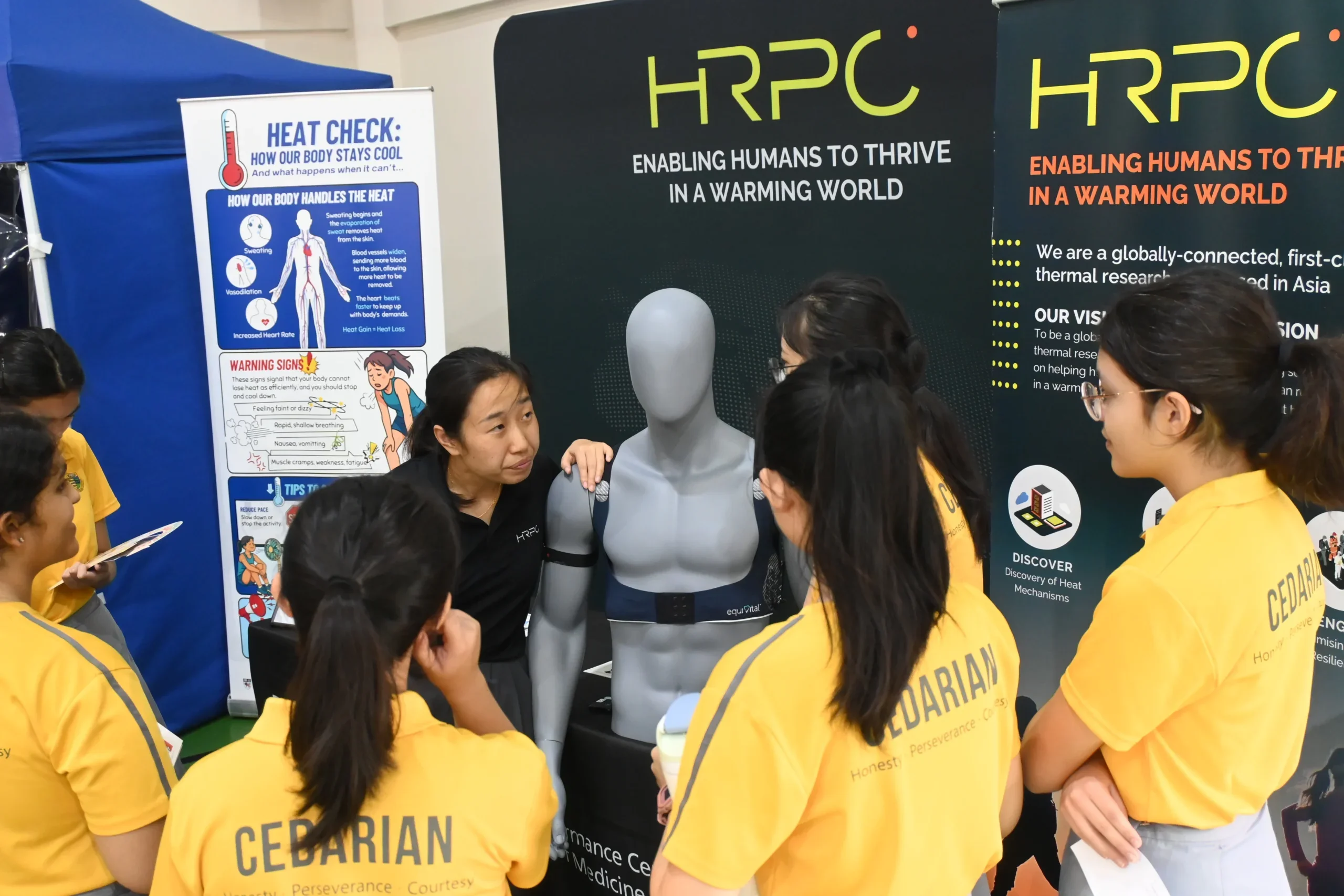 In celebration of the NUS Medicine’s 120th Anniversary and organised under the NUSMedSci Alliance Brew outreach programme, the Heat Resilience & Performance Centre (HRPC) under NUS Medicine held an outreach event at Cedar Girls’ Secondary School on 17 October 2025, where students were invited to explore the science of heat and human heat resilience through three exciting experiences: the Experiential Climate Pod, the Heat Resilience Booth, and a presentation by Cedar alumna Dr Sharifah Badriyah, Research Fellow at HRPC.