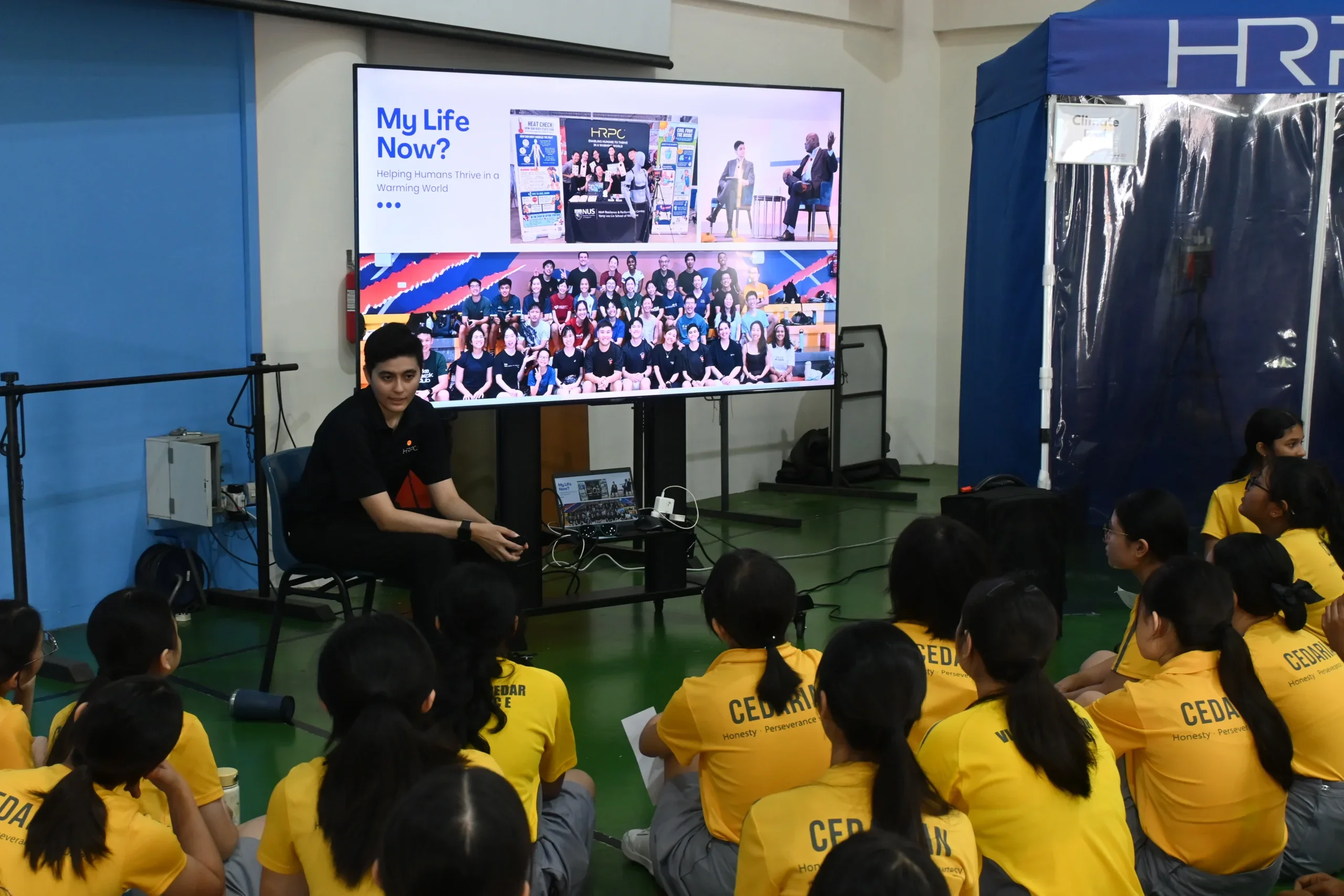 In celebration of the NUS Medicine’s 120th Anniversary and organised under the NUSMedSci Alliance Brew outreach programme, the Heat Resilience & Performance Centre (HRPC) under NUS Medicine held an outreach event at Cedar Girls’ Secondary School on 17 October 2025, where students were invited to explore the science of heat and human heat resilience through three exciting experiences: the Experiential Climate Pod, the Heat Resilience Booth, and a presentation by Cedar alumna Dr Sharifah Badriyah, Research Fellow at HRPC.