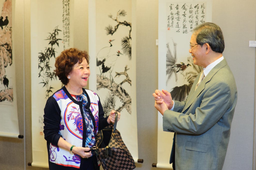Professor Kua, the Tan Geok Yin Professor in Psychiatry and Neuroscience, introducing some of the Chinese Ink Paintings on display.