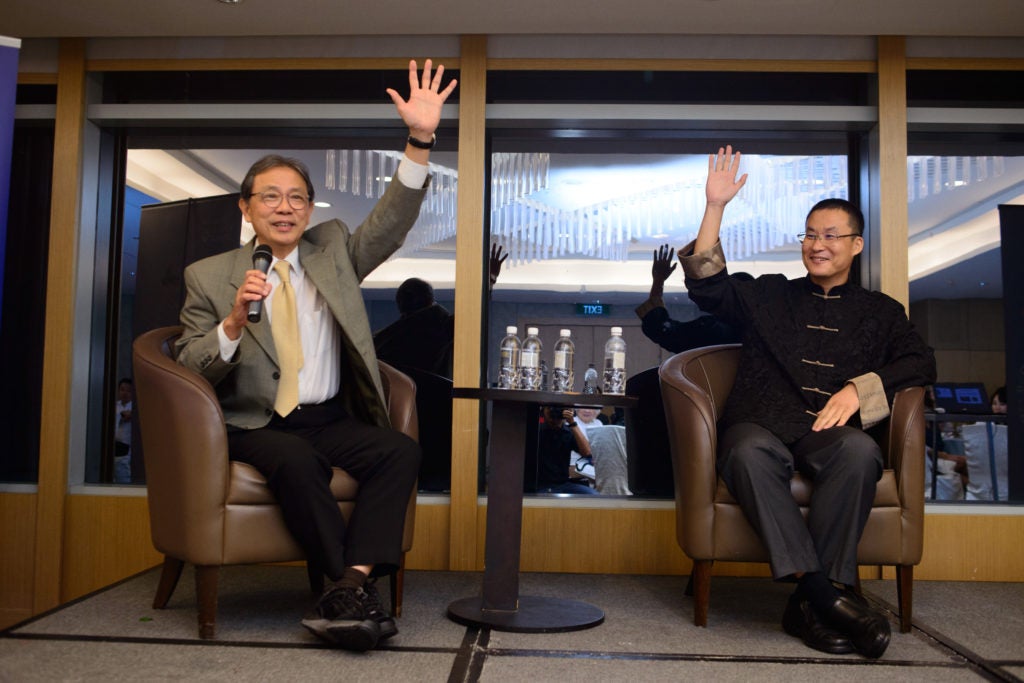 Emcees inviting Professor Kua Ee Heok on stage for the opening address.