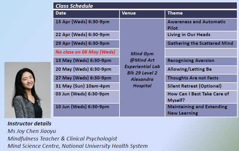 The class will be held weekly at the newly renovated Mind Gym @ Mind Art Experiential Lab (MAEL) at Blk 29, Level 2, Alexandra Hospital.
