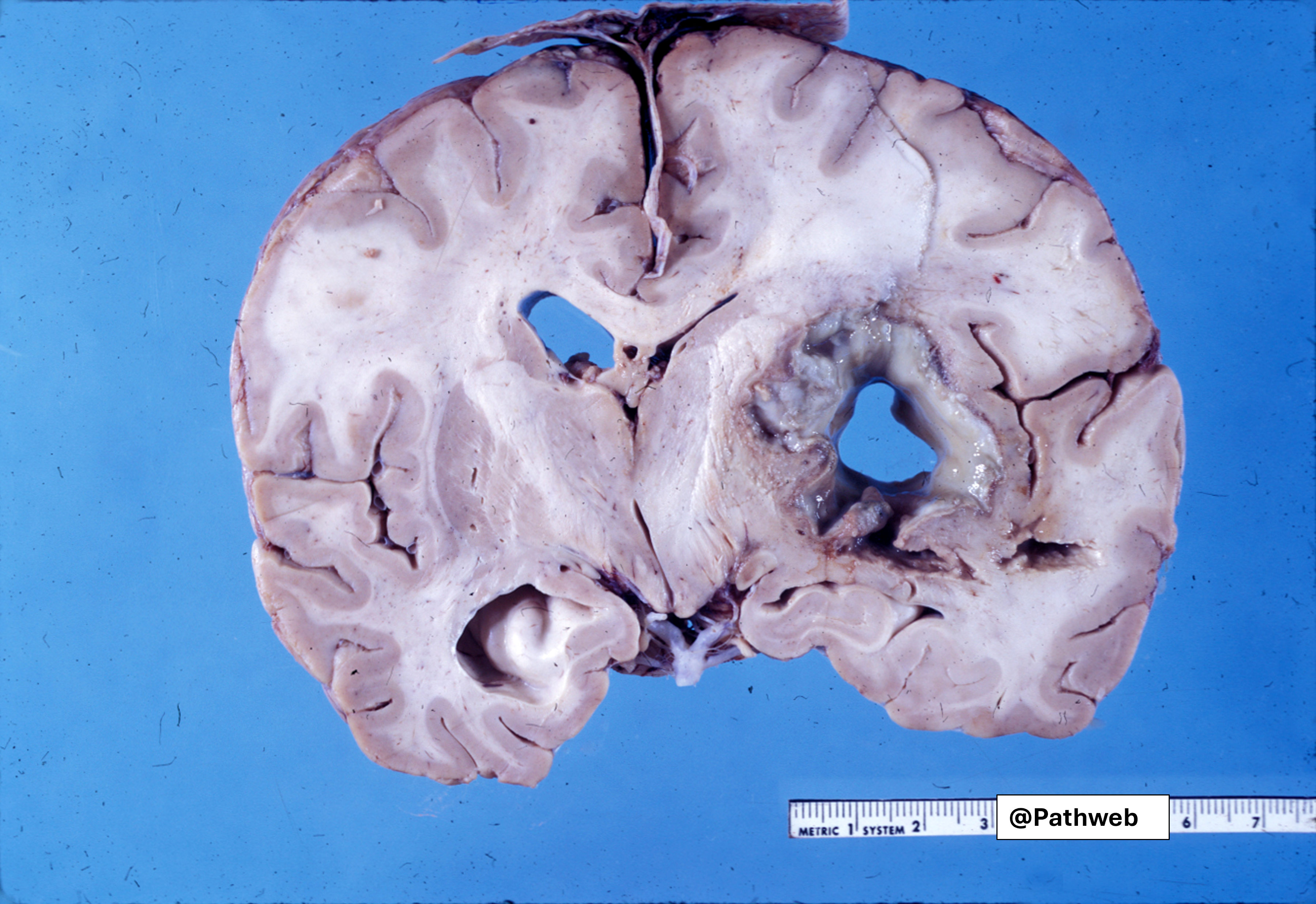 There is compression but no rupture into the lateral ventricle.