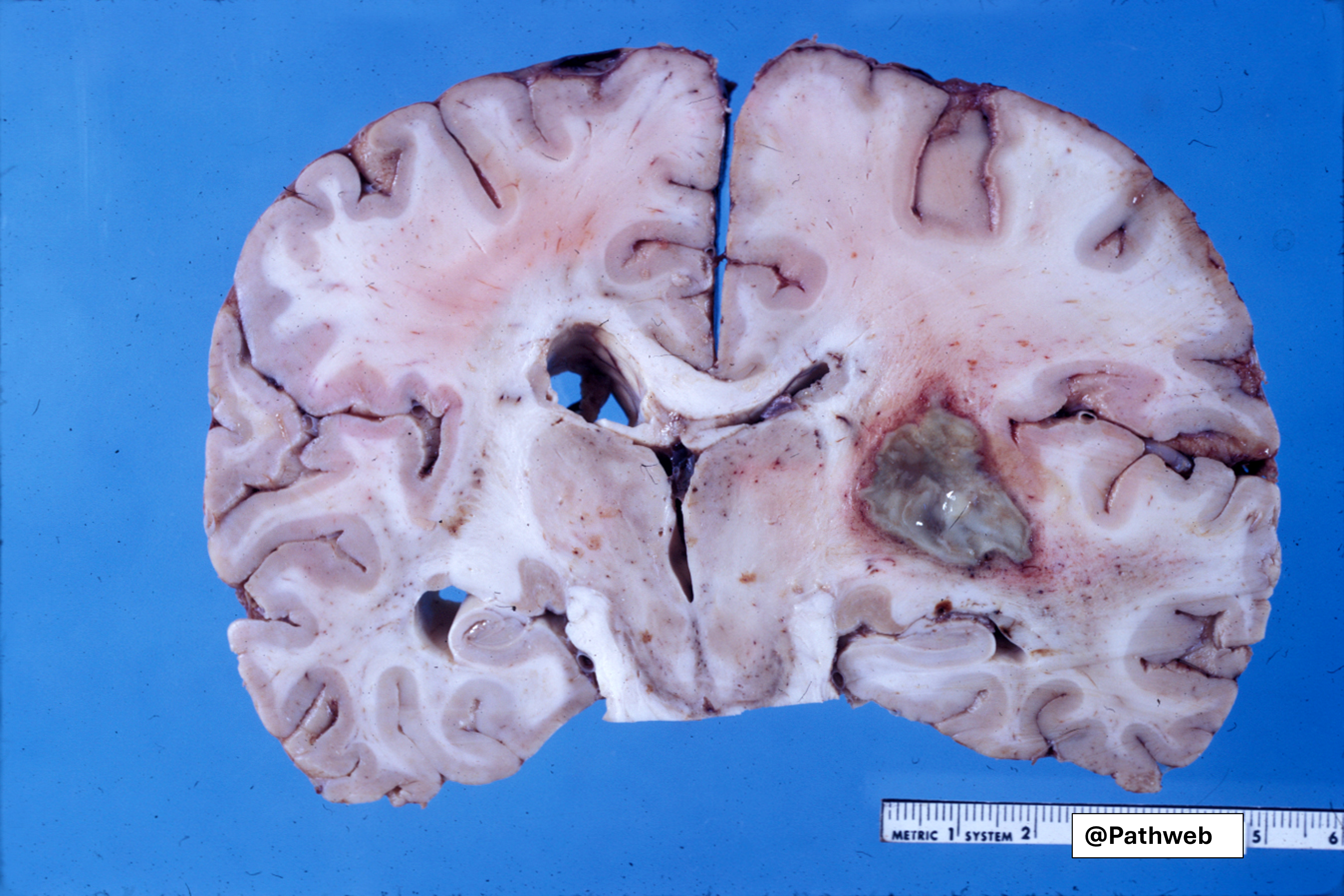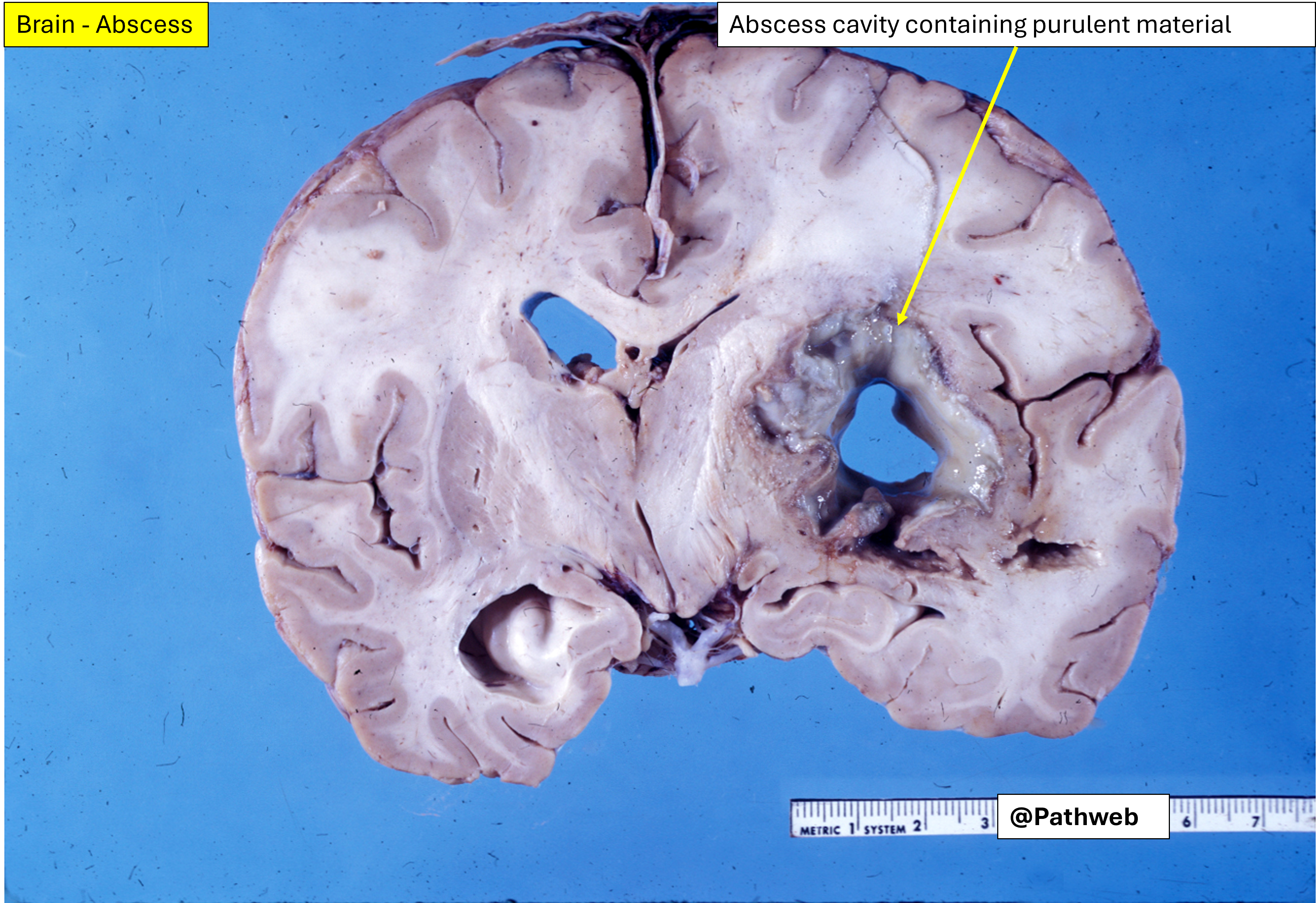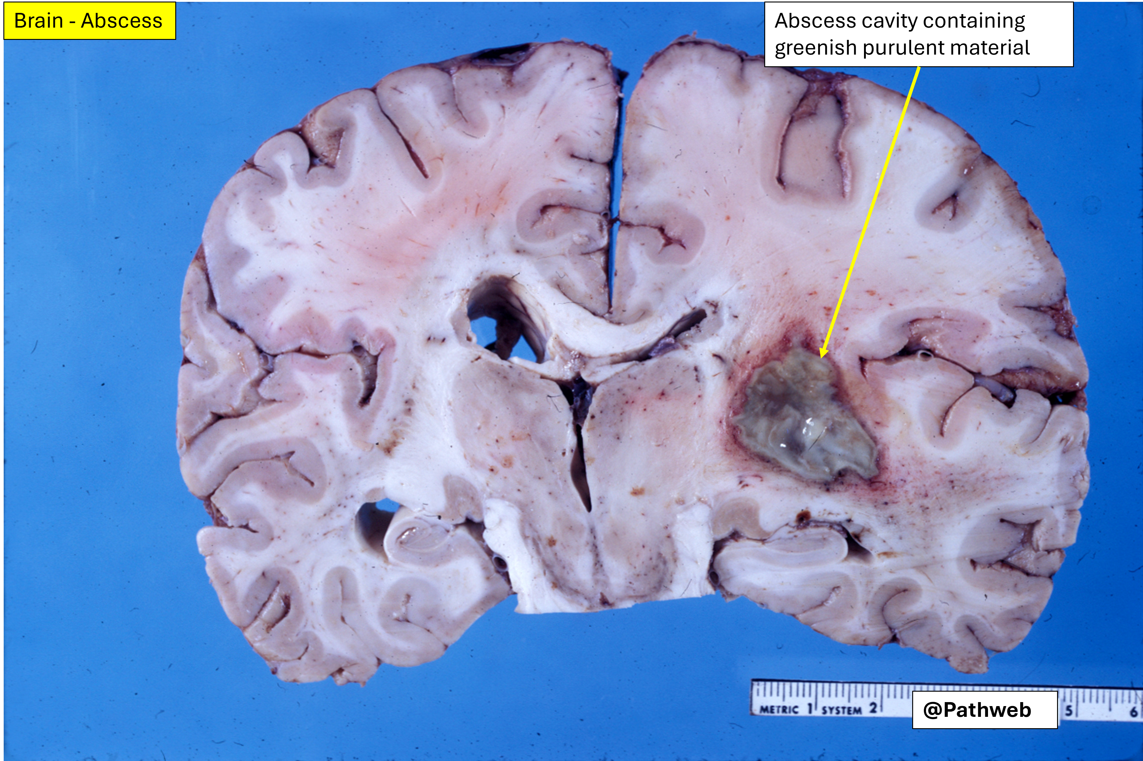 The affected cerebral hemisphere is swollen. Cut surface shows a large well-defined cavity (due to liquefactive necrosis and suppuration) lined by a layer of creamy fibrinopurulent exudate resting on a collagenous capsule.