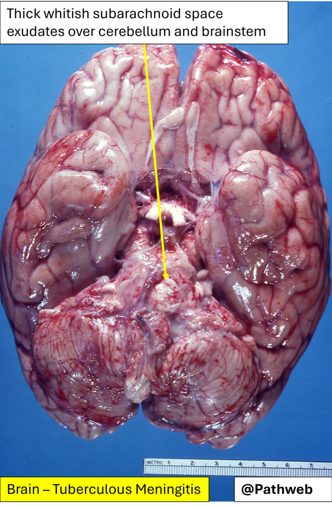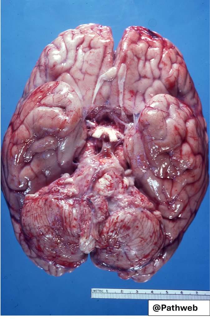 There is a pale tan fibrino-inflammatory exudate over the base of the brain within the subarachnoid space. The exudate effaces the cisterns and encases the cranial nerves. Arachnoid fibrosis has set in, resulting in internal hydrocephalus.