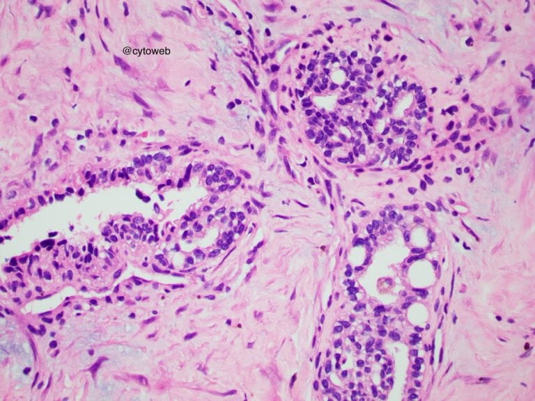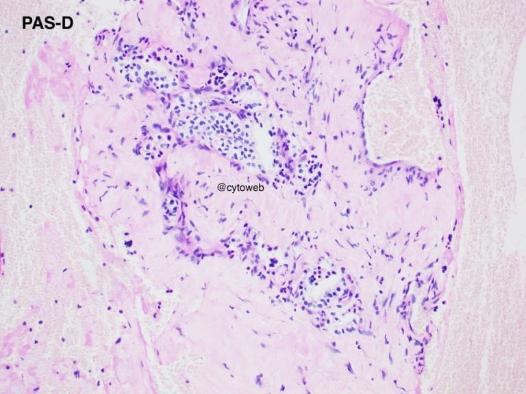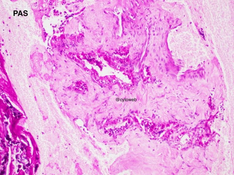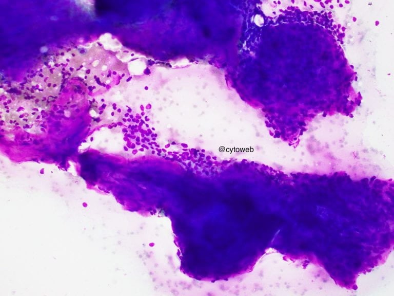 Clinical history: A 50-year-old female was found to have an incidental solitary multi-septated cyst in the pancreatic neck. There was enhancement of the septa of the cyst on CT imaging. Endoscopic ultrasound showed an echogenic central area. The cyst does not communicate with the pancreatic ductal system. Fine needle aspiration of the lesion was performed and 1ml of clear watery fluid was aspirated.