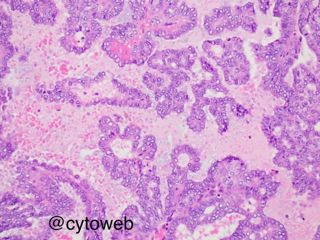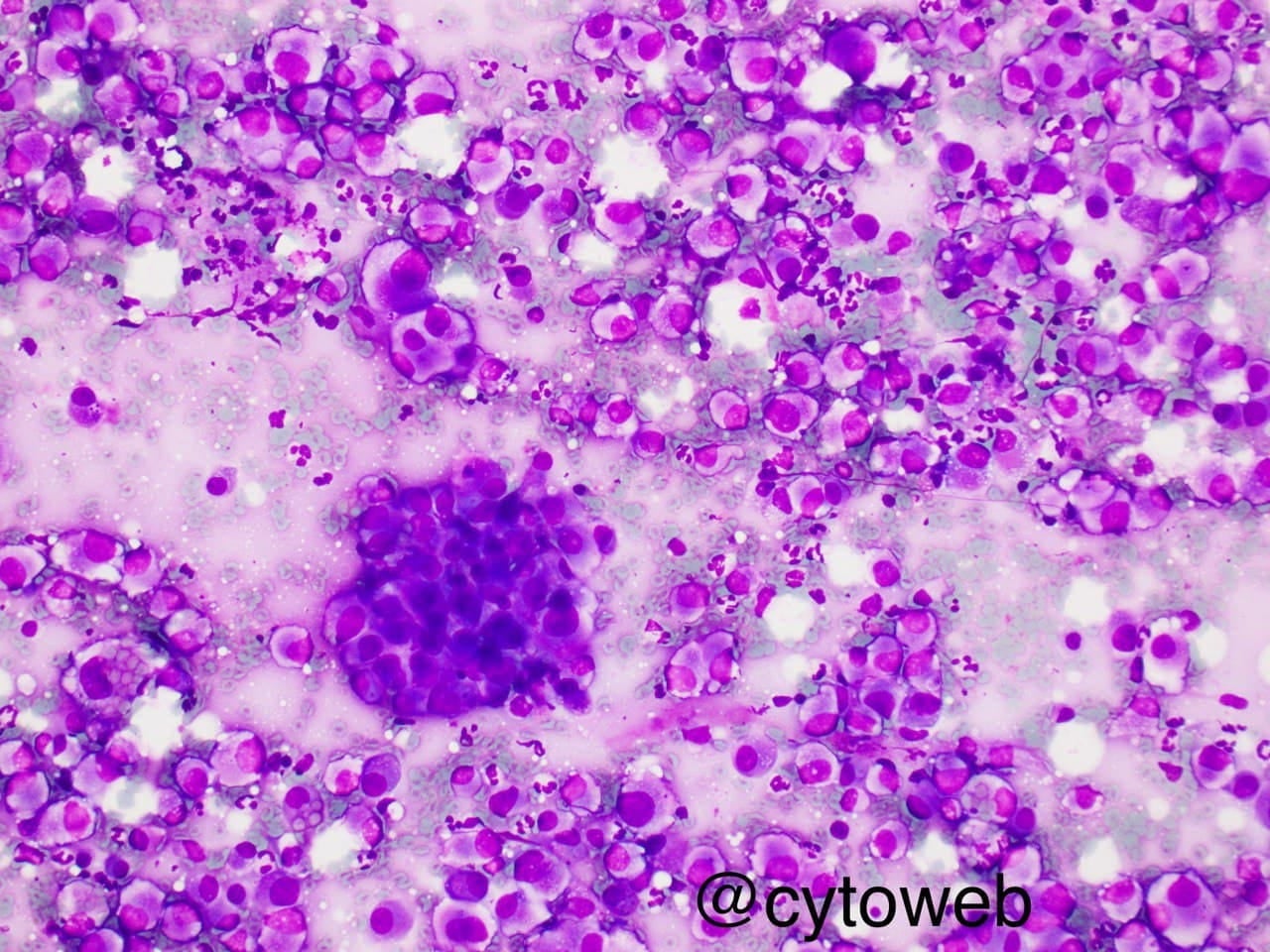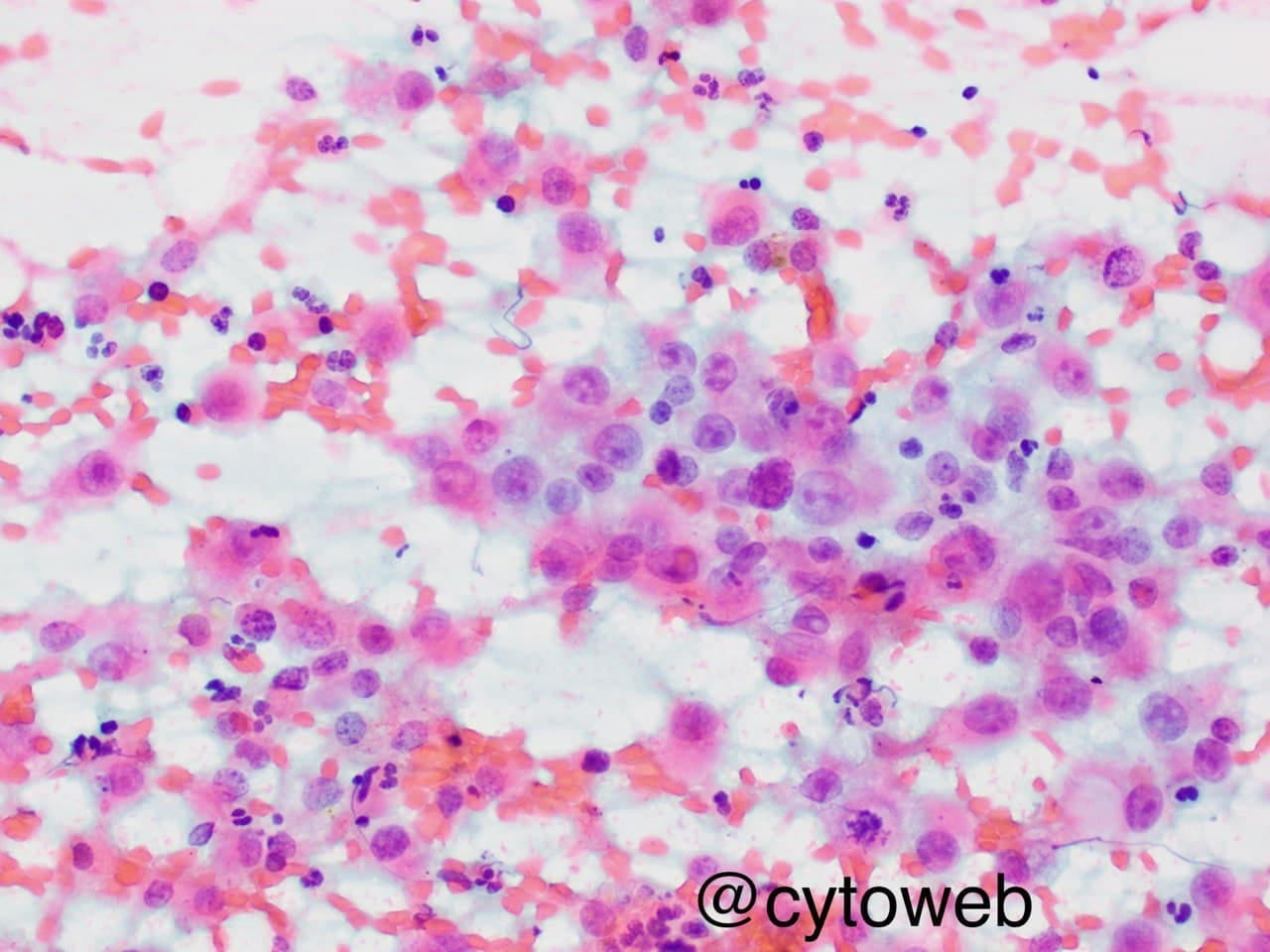 The salient, but non-specific, cytomorphologic features of secretory carcinoma include the presence of epithelioid cells arranged in sheets, clusters, papillae and as single dispersed cells. The nuclear features are low grade, characterized by mild nuclear enlarged, membrane irregularity and small nucleoli. Identifying the presence of moderate to abundant cytoplasm with multivacuolation may be a helpful clue. These cells may also have an oncocytoid appearance. Another clue is the presence of mucoid or proteinaceous material in the background.