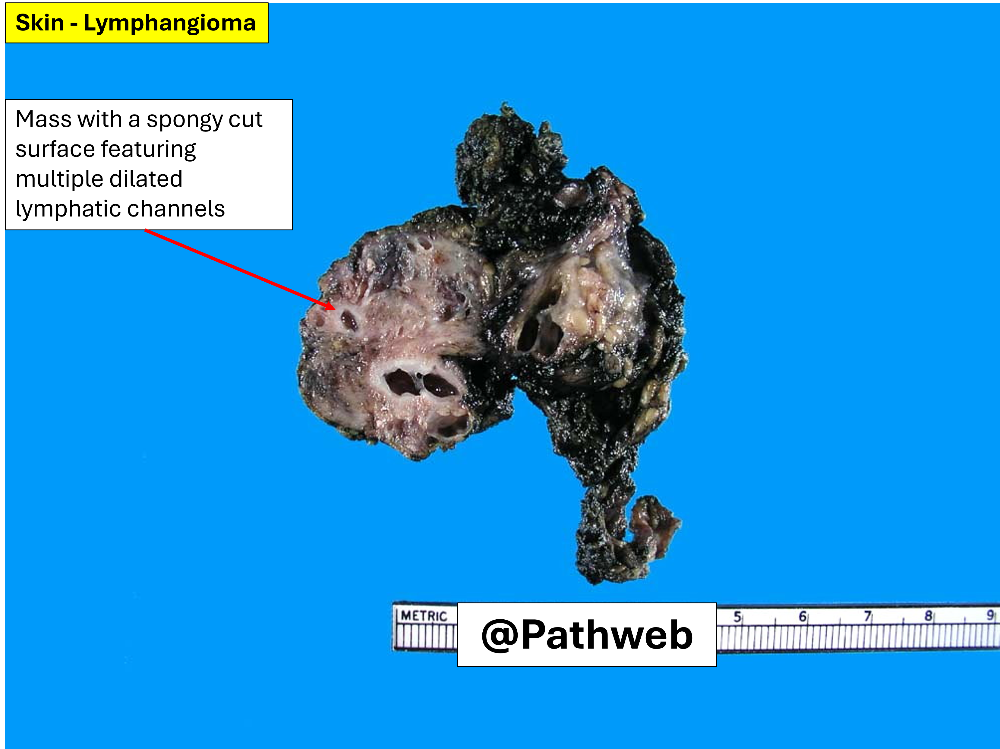 Within the subcutis, there is a mass with a spongy cut surface, showing many dilated lymphovascular channels. No solid fleshy areas areas are seen. The appearance is similar to that of a cavernous haemangioma except that in the fresh specimen, the channels would not contain blood