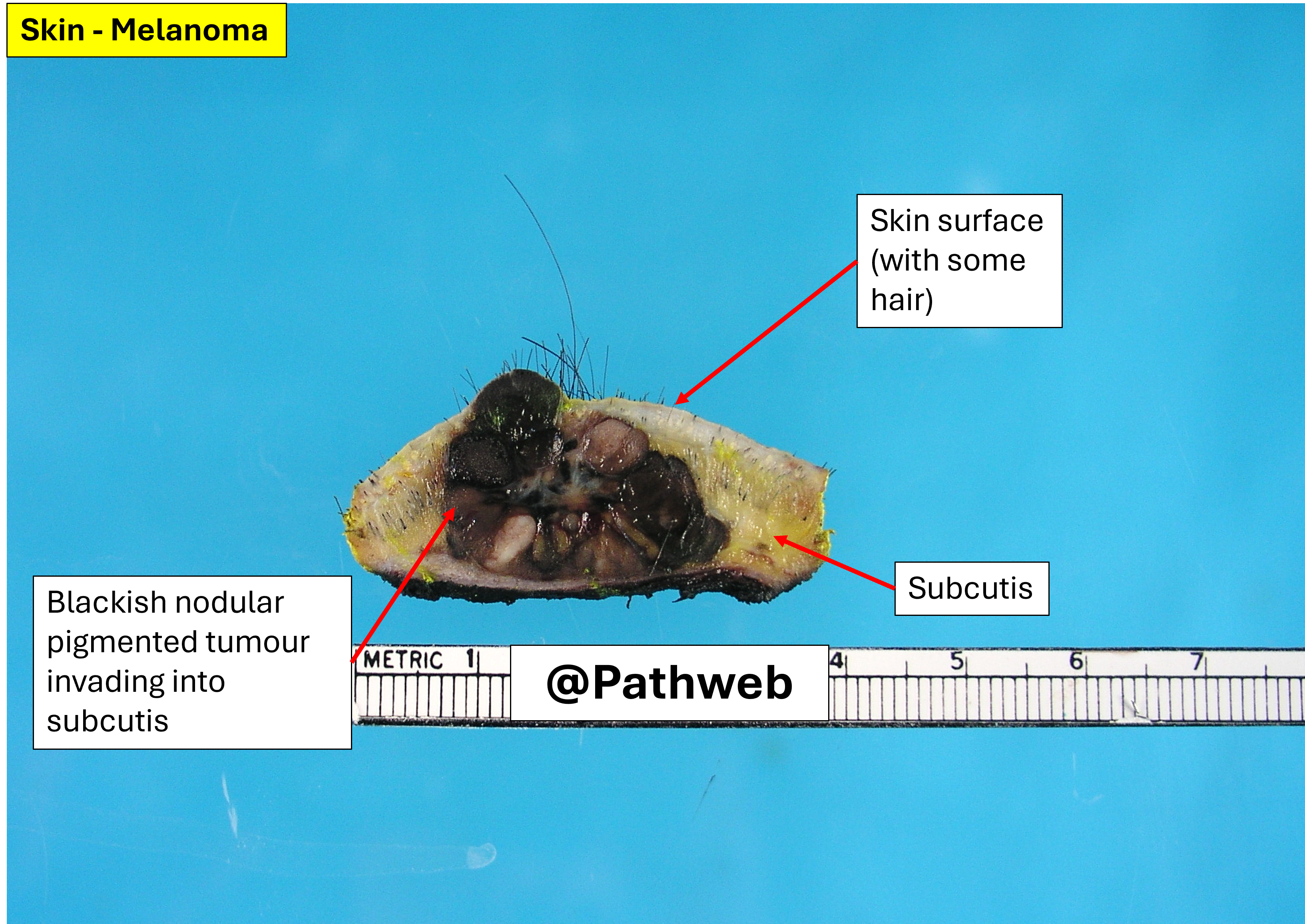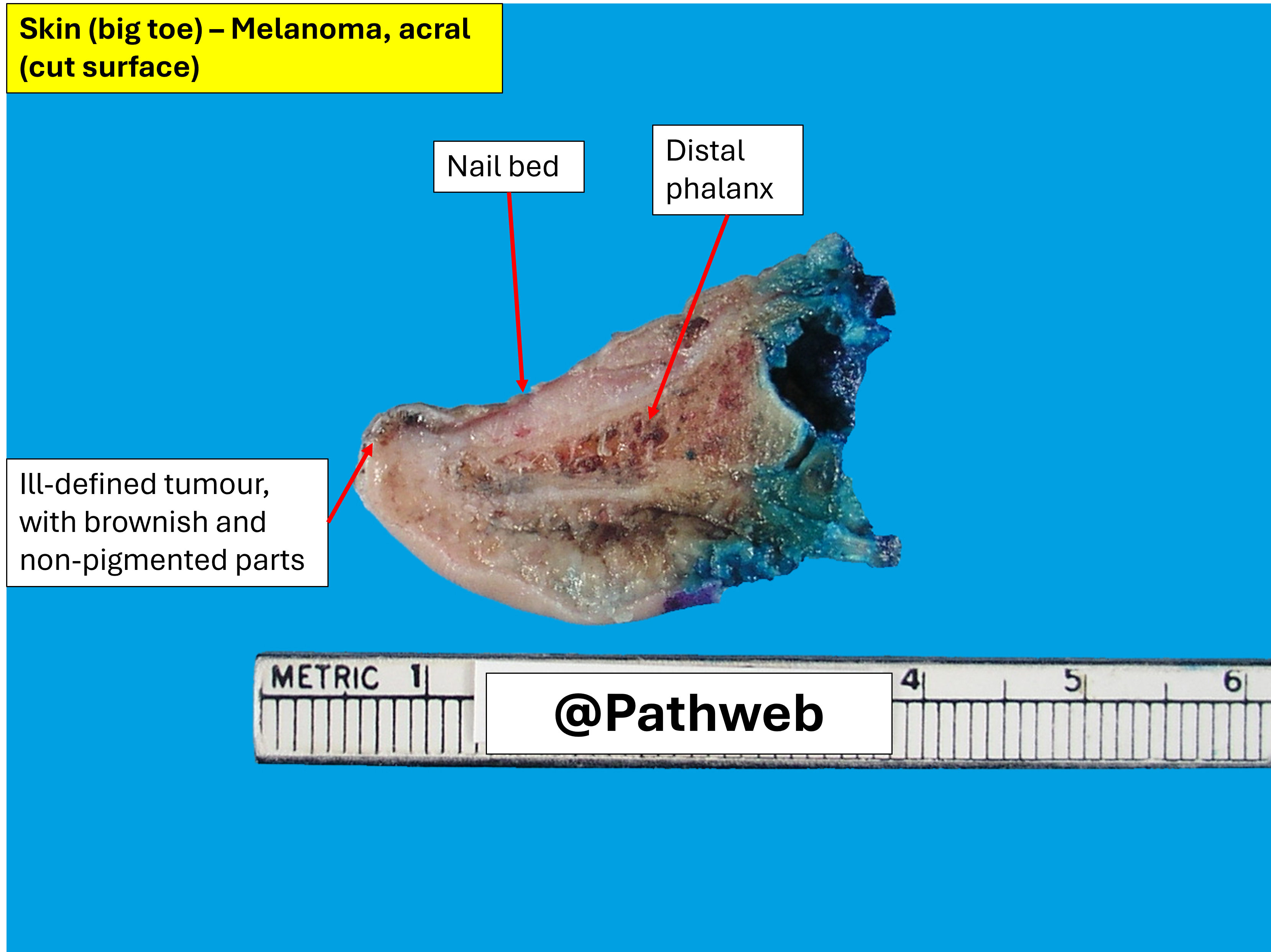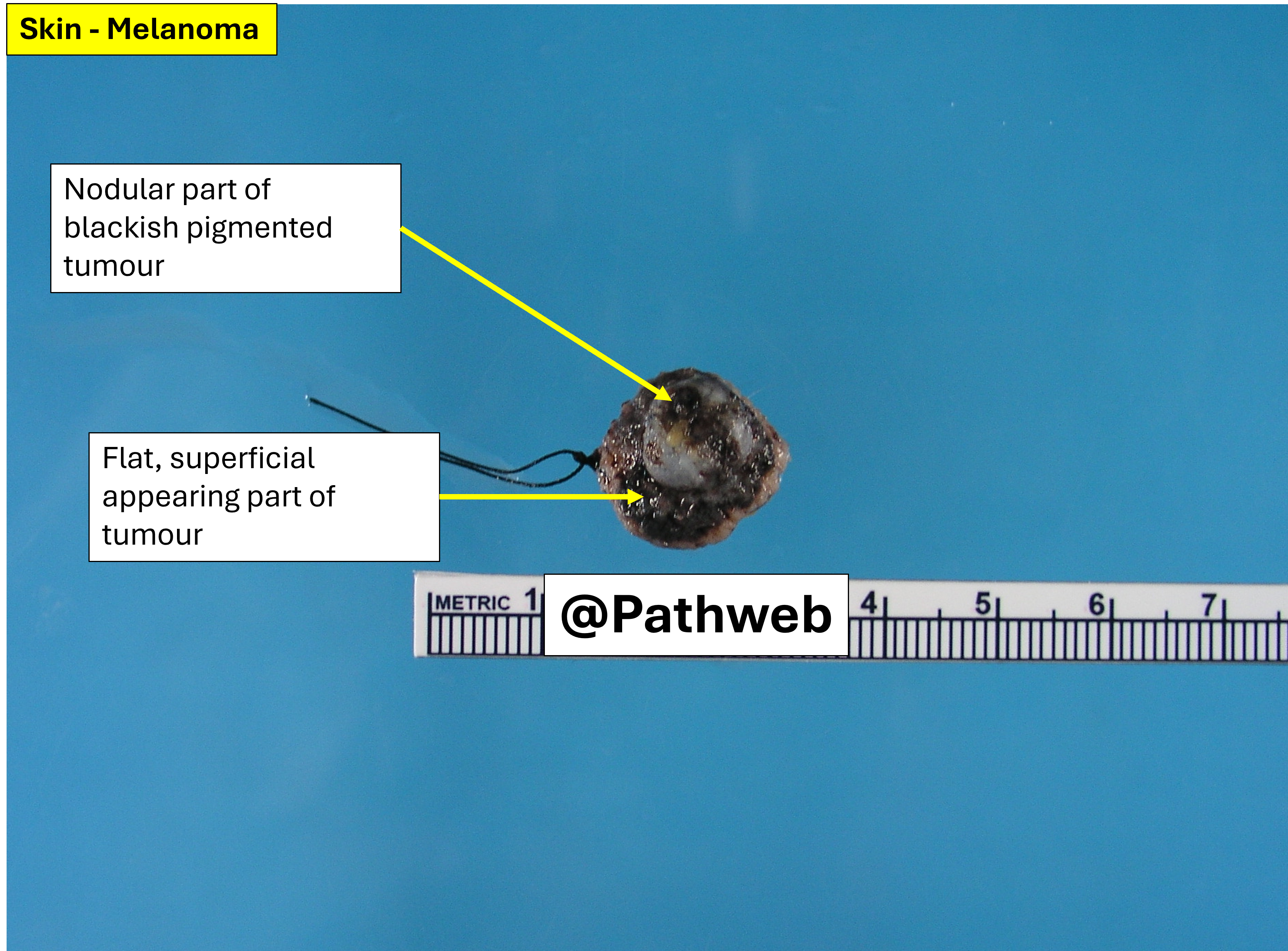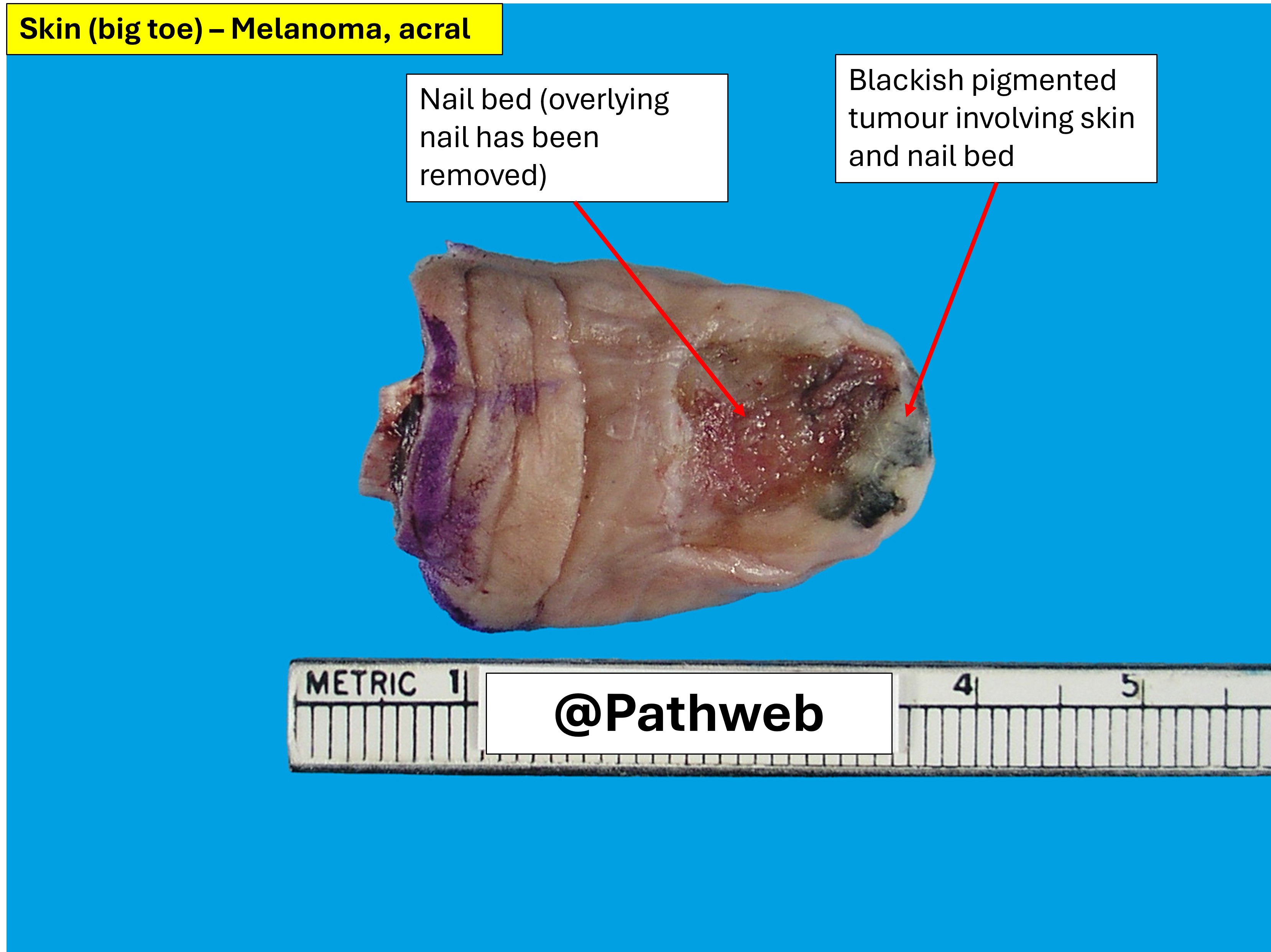 53 year old man with a painless raised area over the ball of his right foot, with a darker appearance.