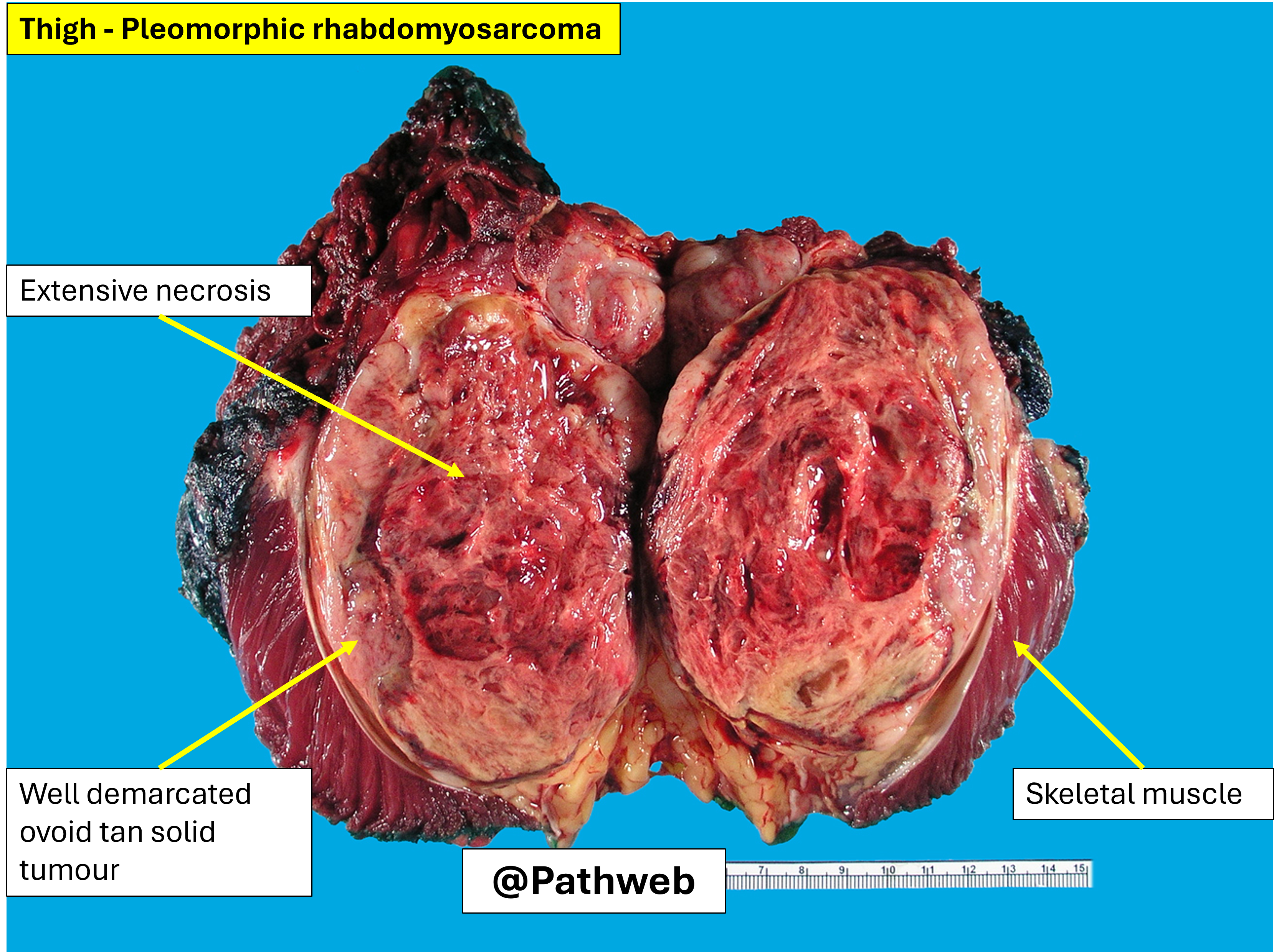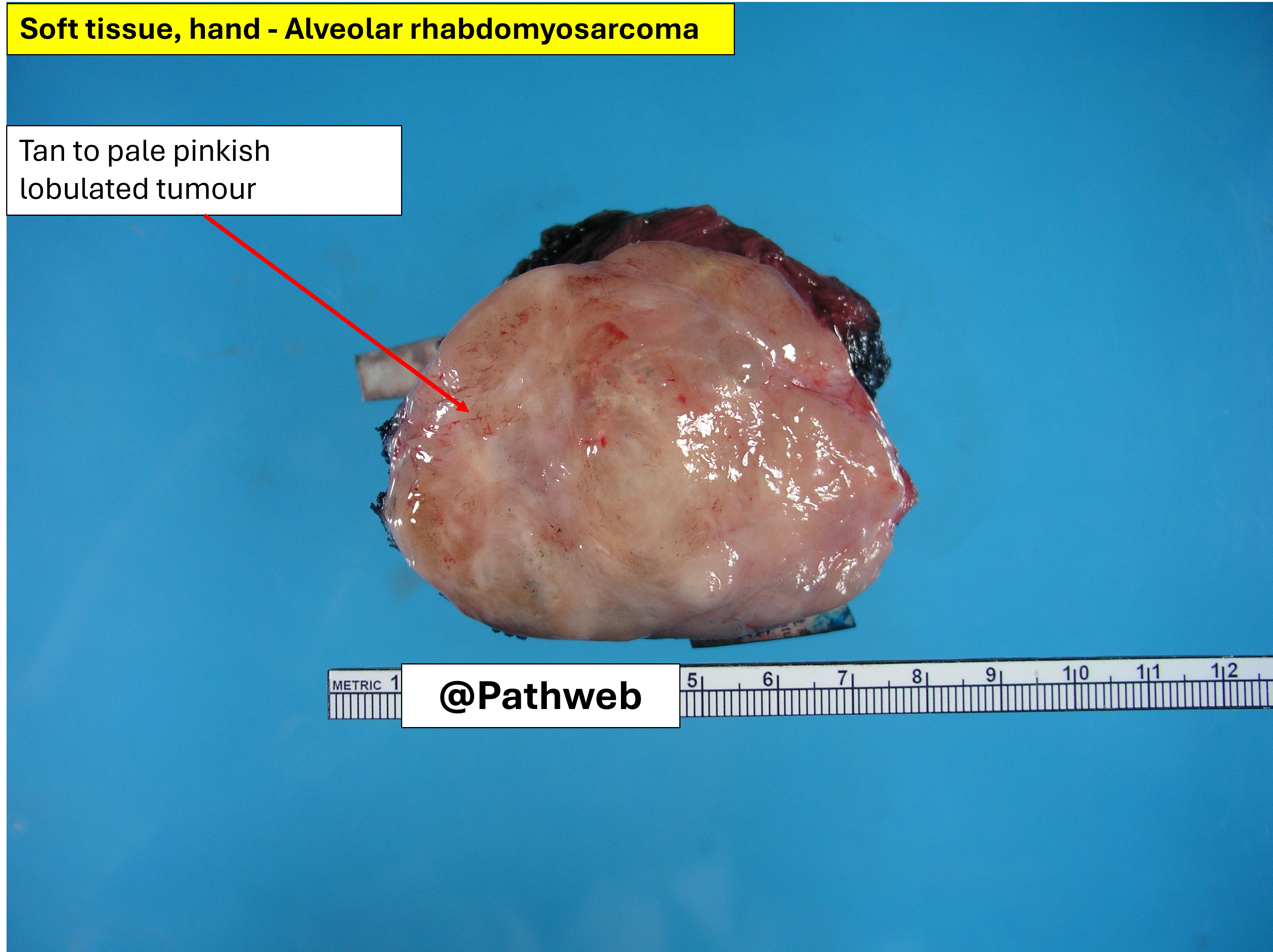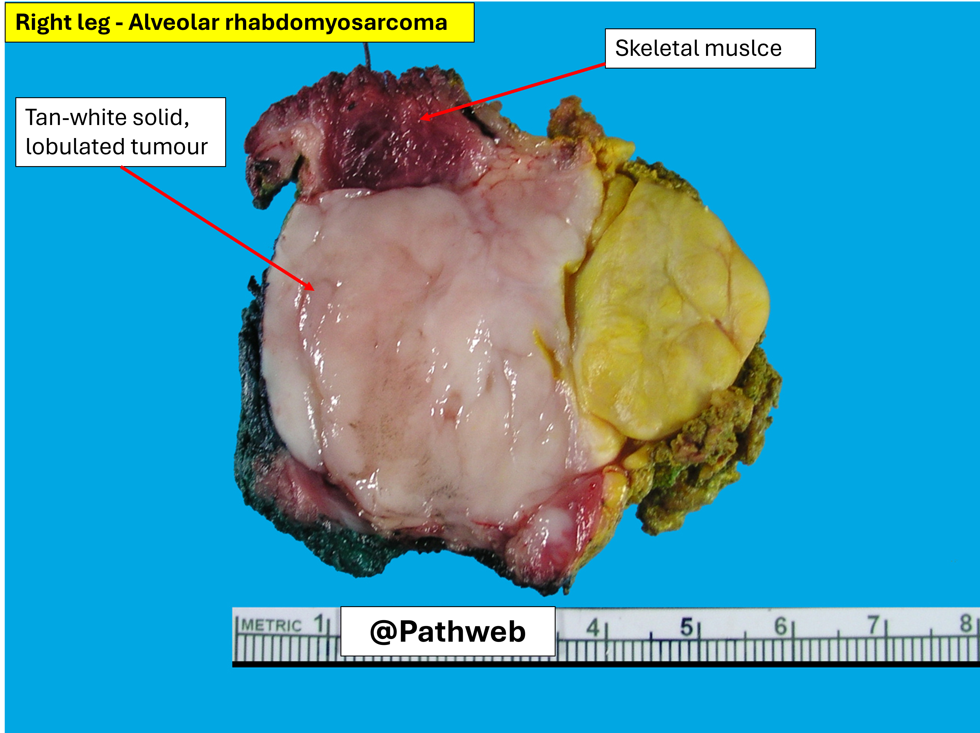 There is a fleshy tan mass occurring within the skeletal muscle, infiltrating into the surrounding brownish muscle tissue. The overlying skin is intact. Other sites for rhabdomyosarcoma in children and adolescents are in the head and neck (sinuses) and urogenital tract