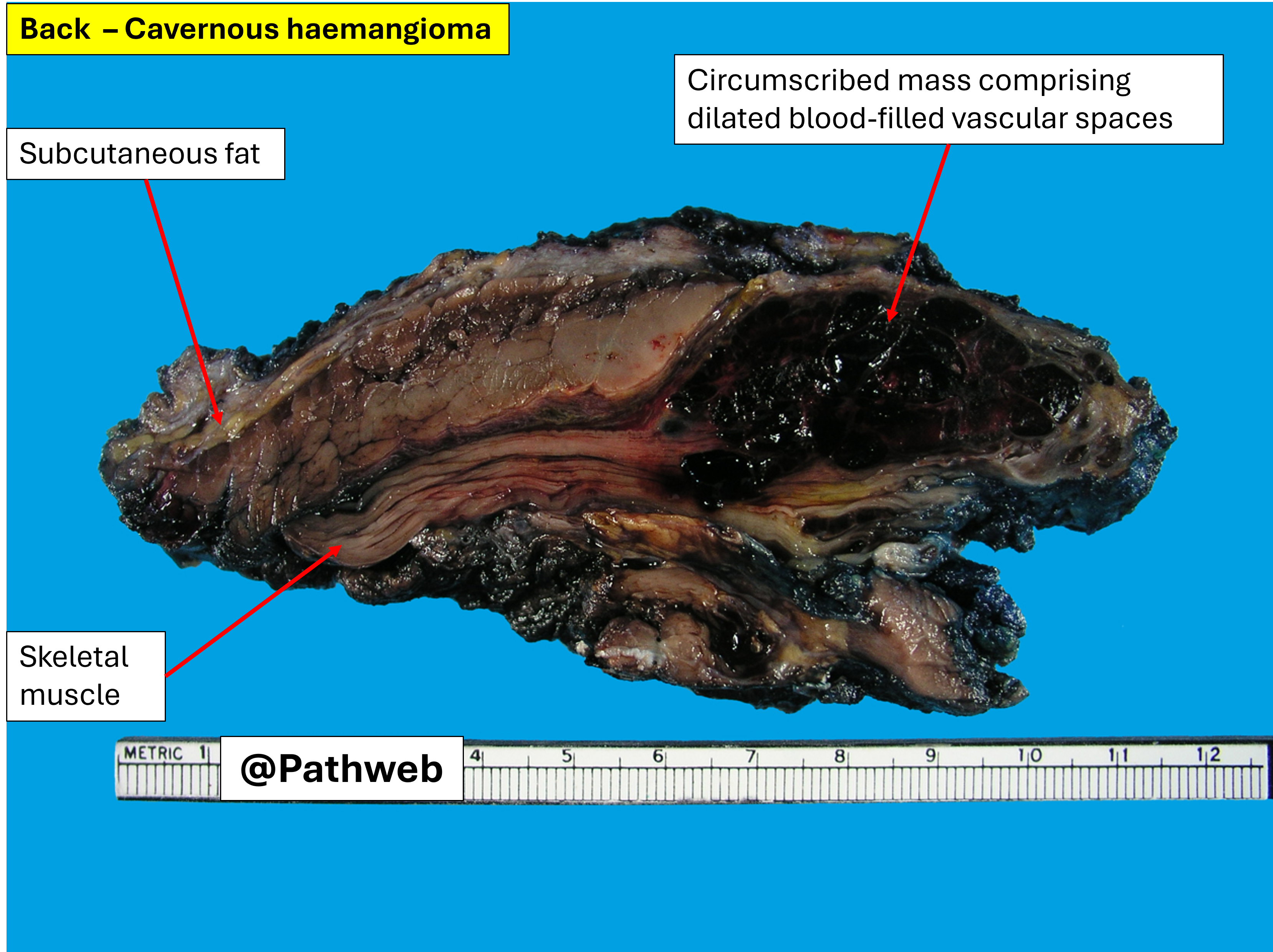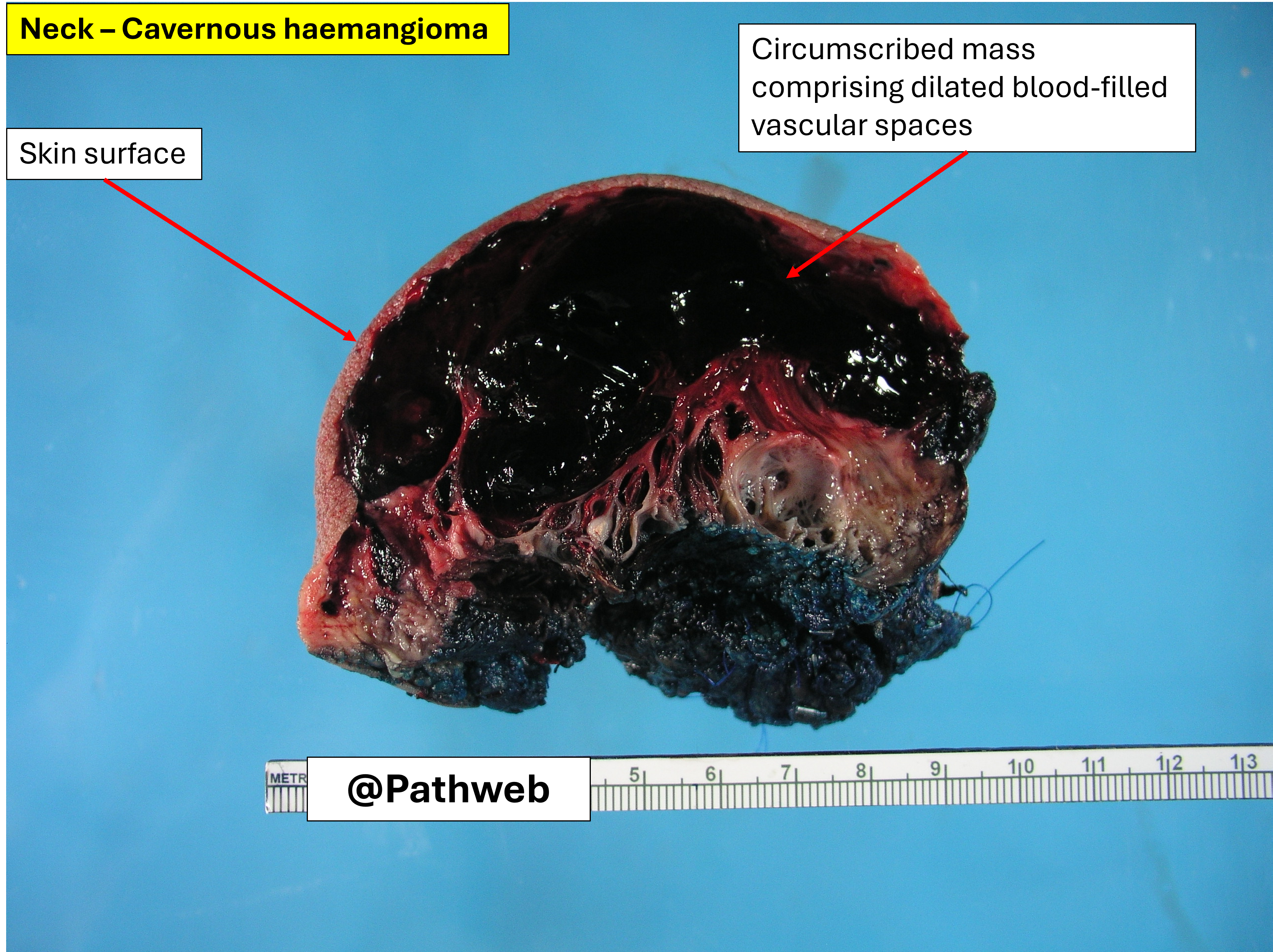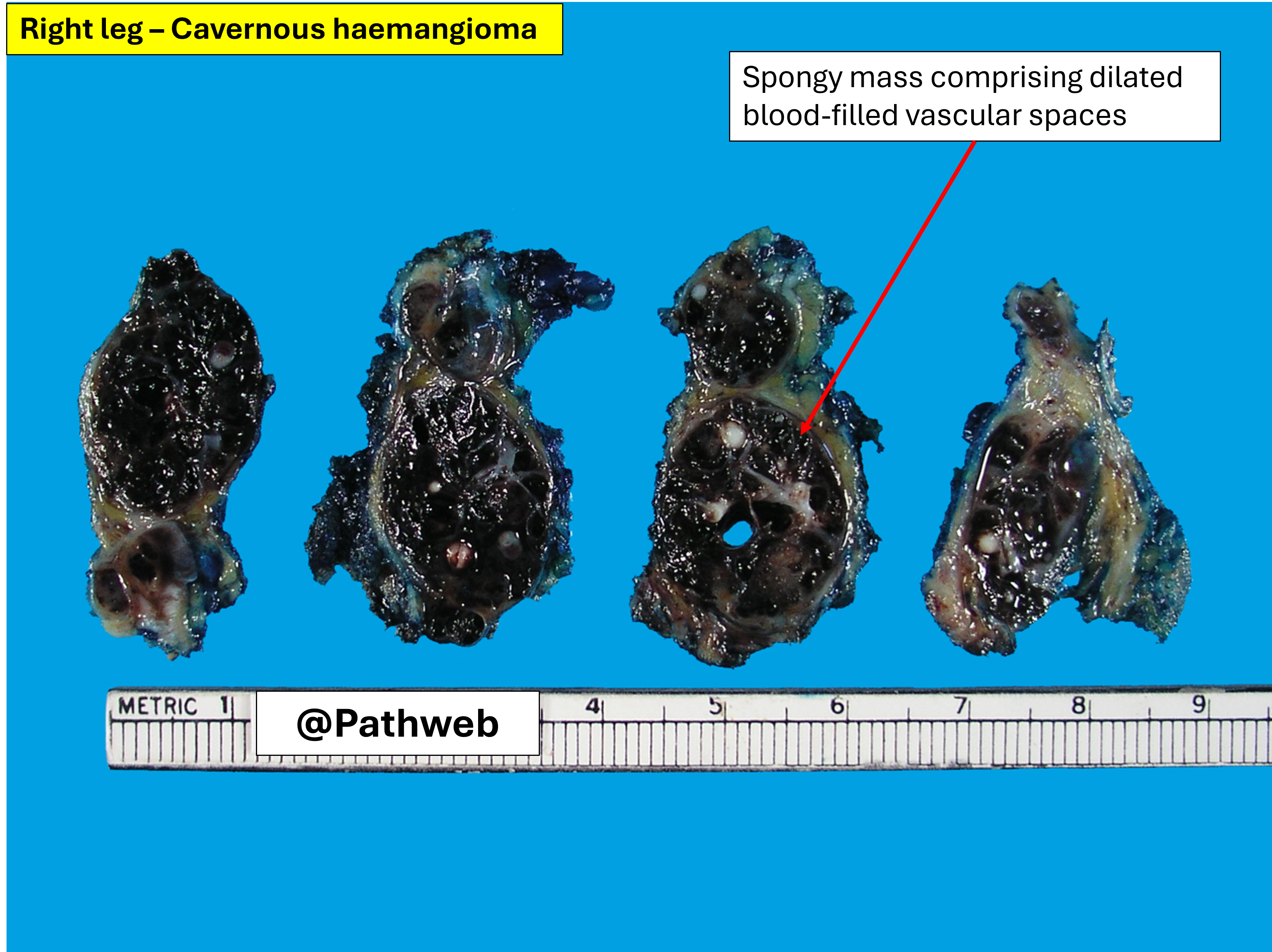 The skin surface is intact. There is an underlying network of dilated vascular spaces, imparting a coarse spongy appearance. In the fresh specimen, these would have been filled with blood. Sometimes, calcifications or small thrombi may also be seen in some of the spaces