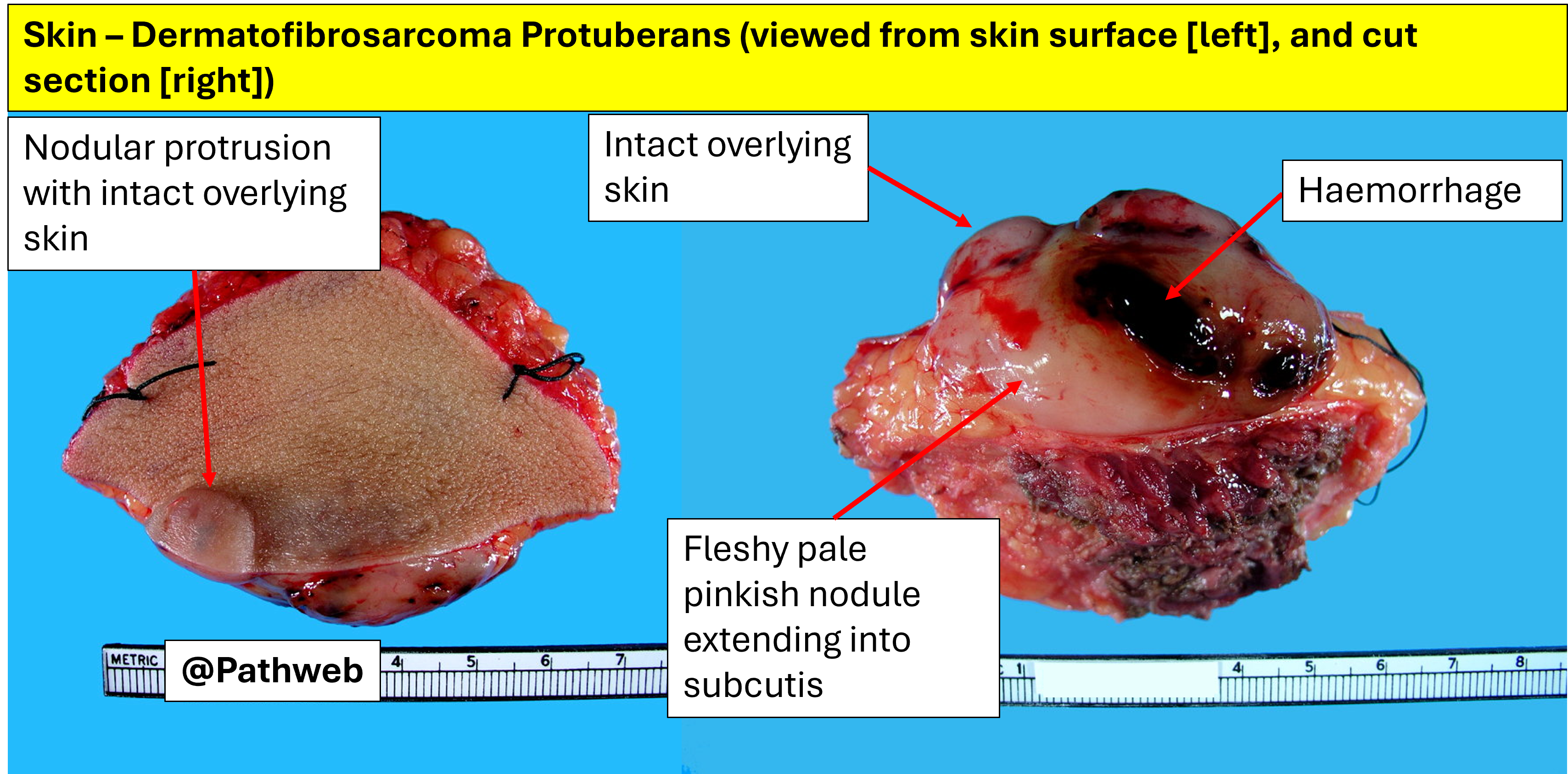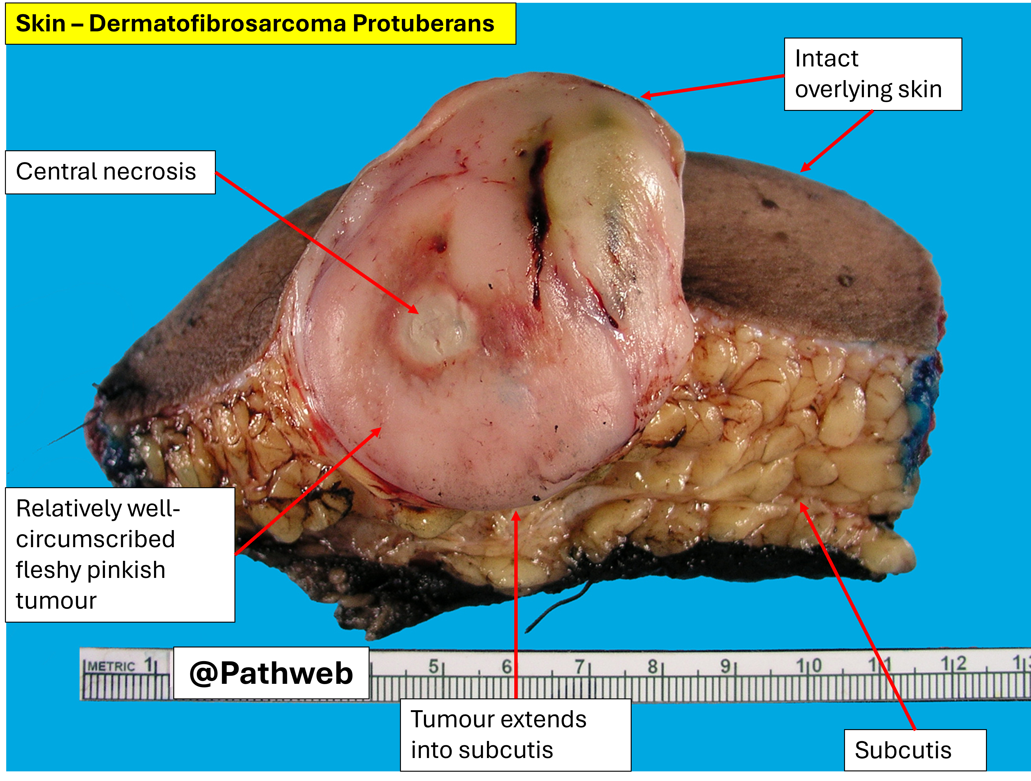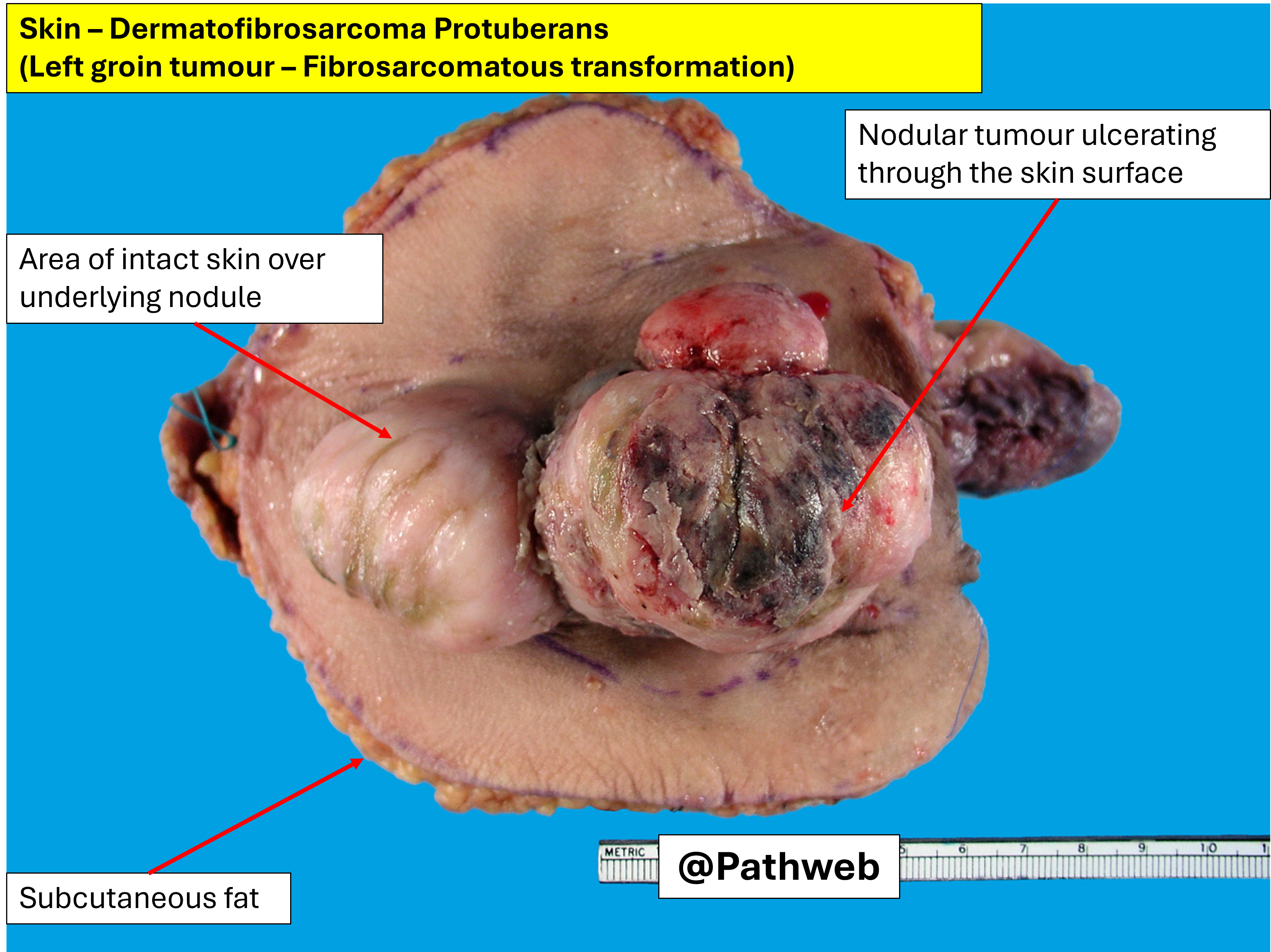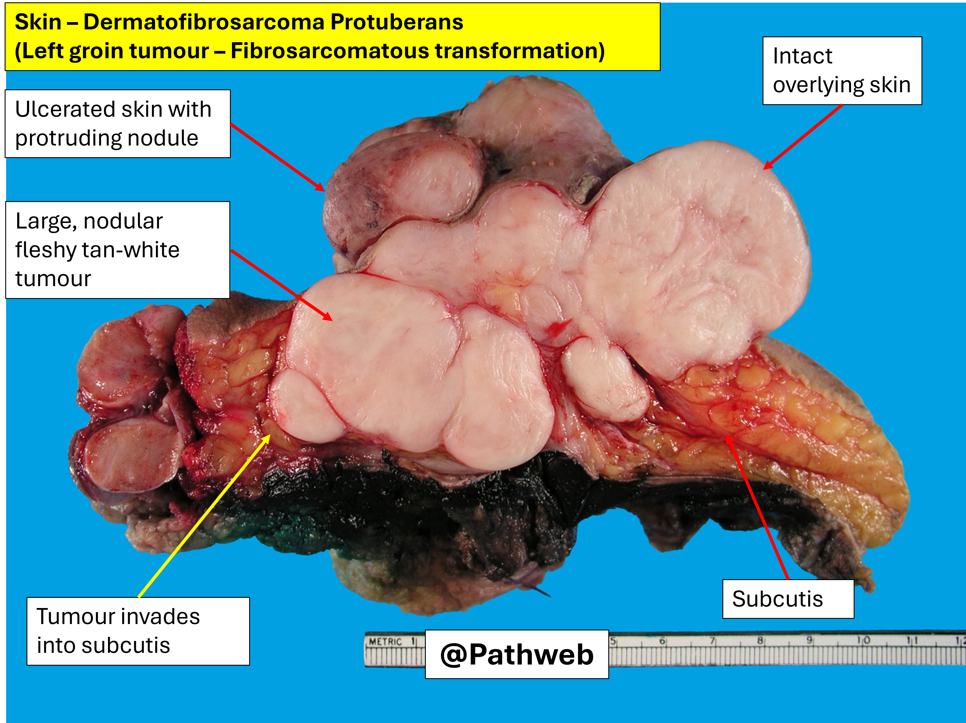 There is a skin-covered nodule with some erosions of the overlying skin. The cut surface shows a tan, ill-defined mass expanding the dermis and infiltrating into the subcutis. No necrosis is seen.