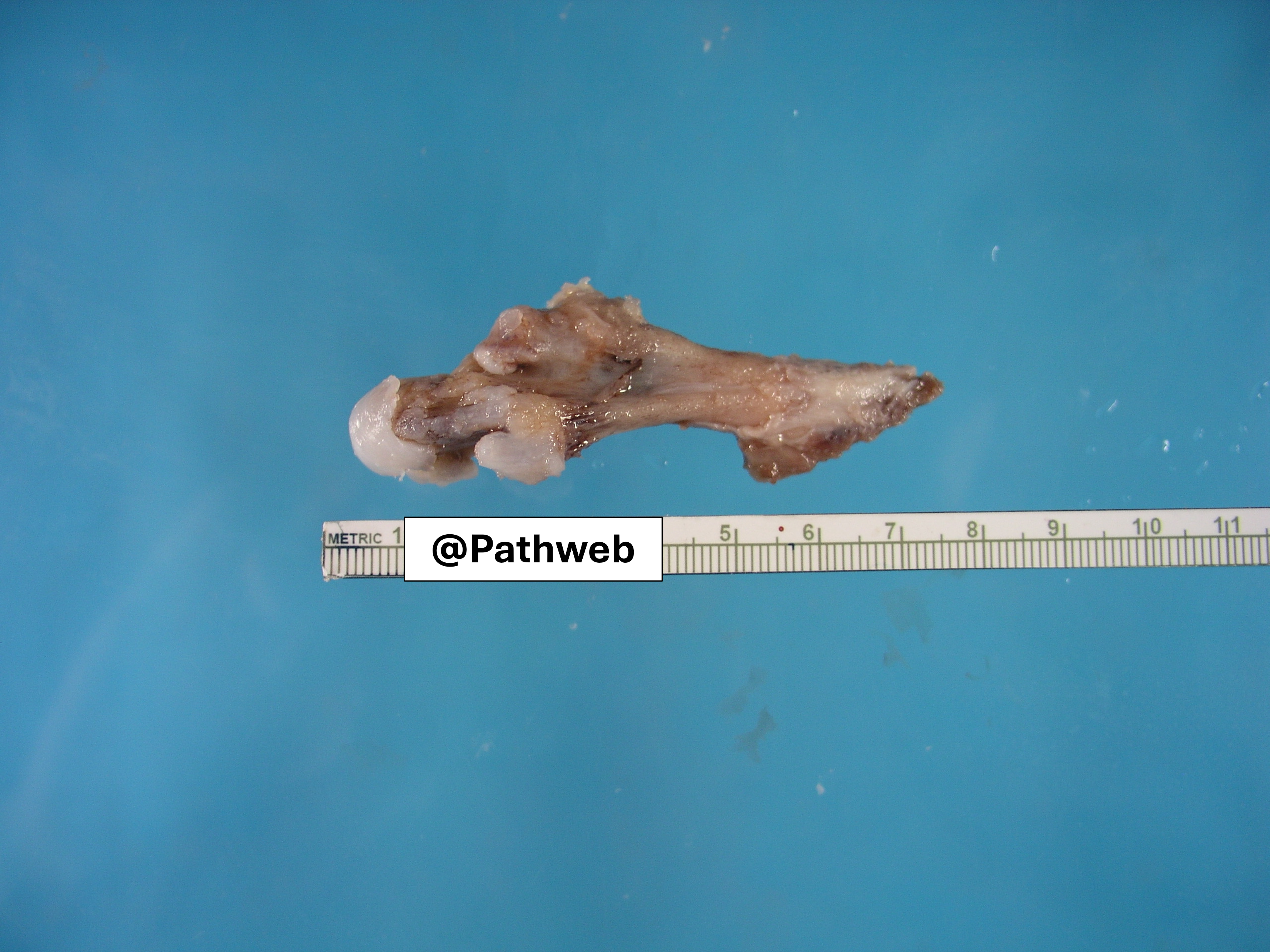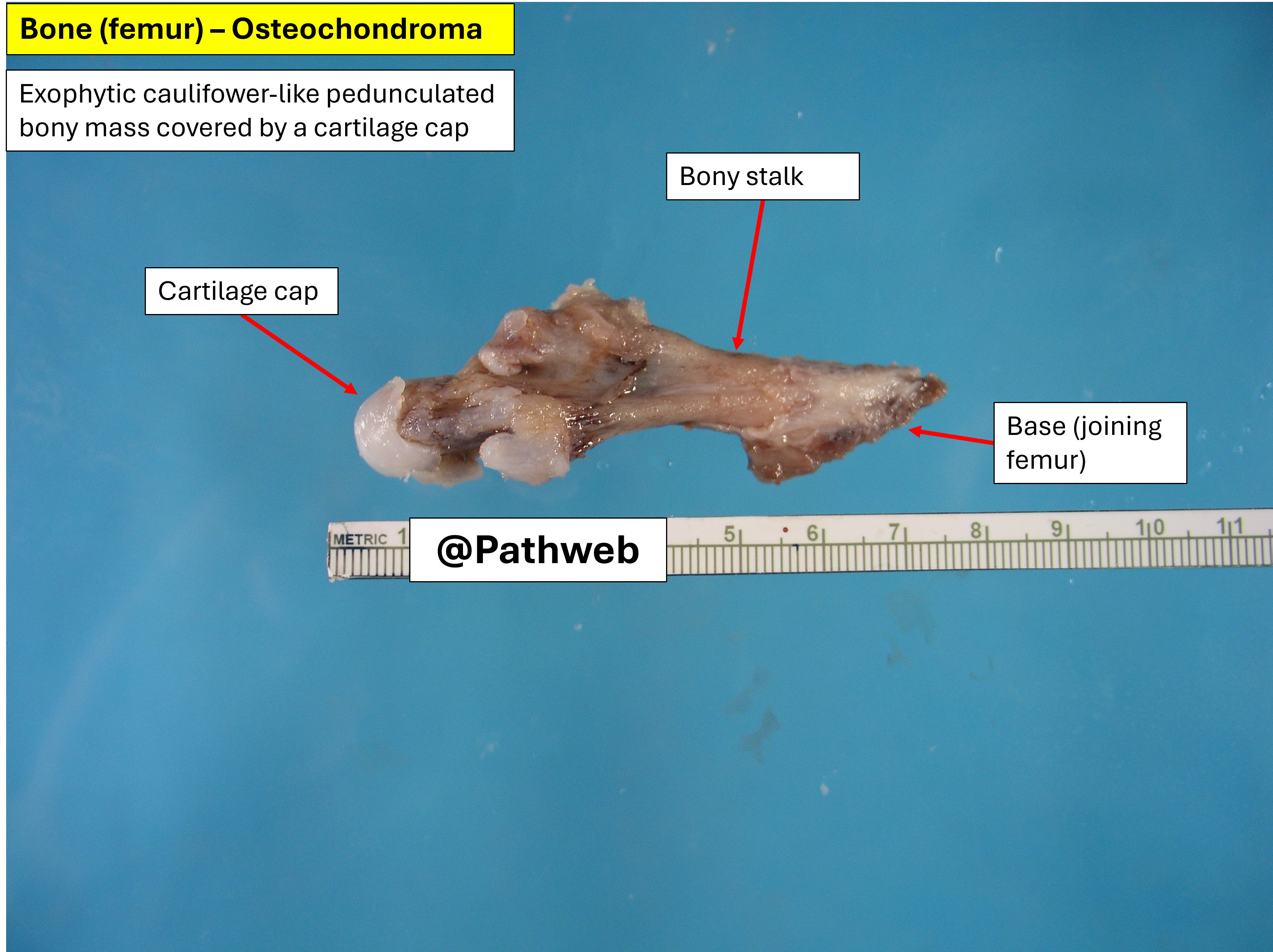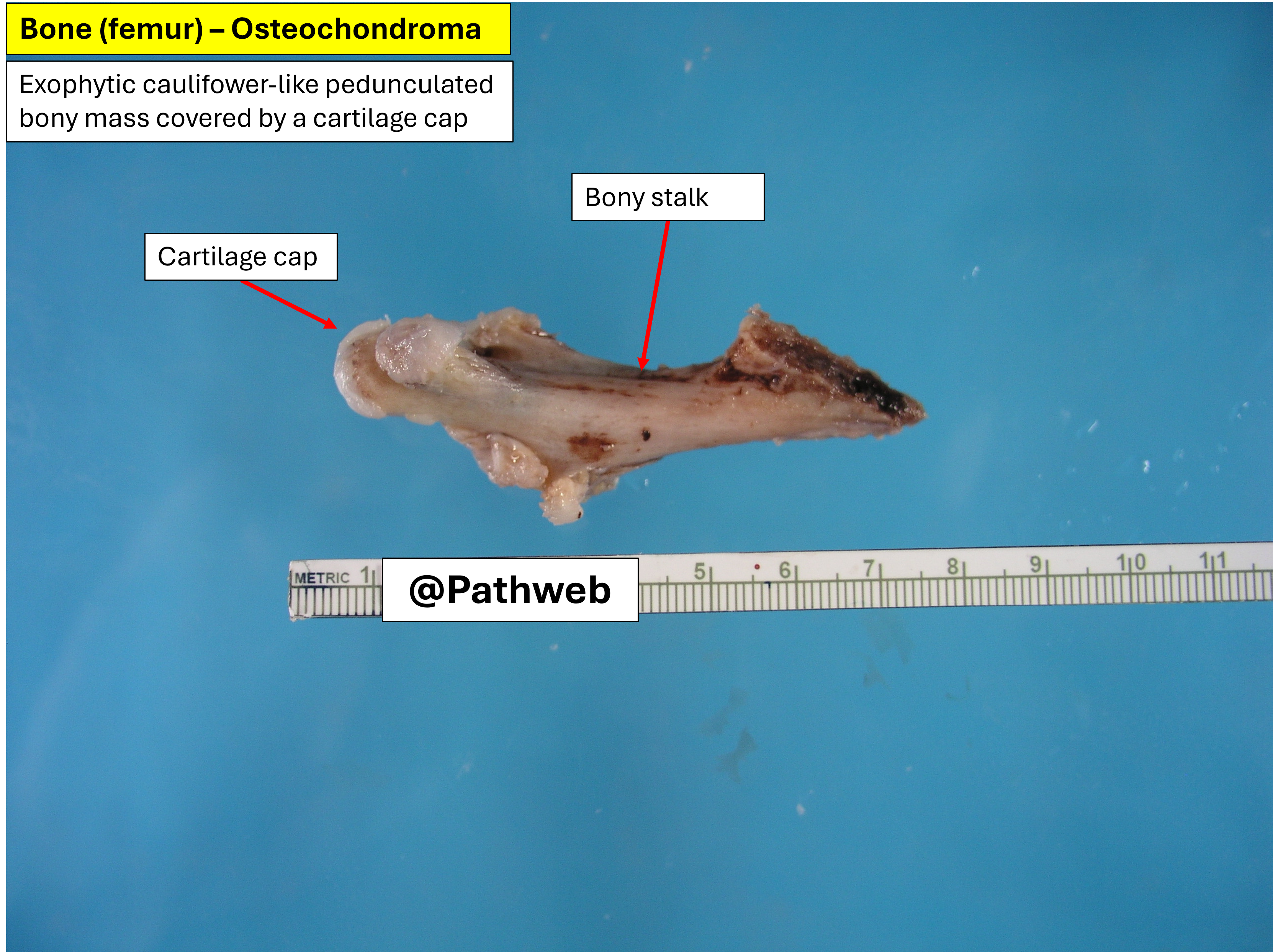 There is a hard and exophytic, cauliflower-like pedunculated mass composed of bone covered by a thick cartilage cap. There is a bony stalk.