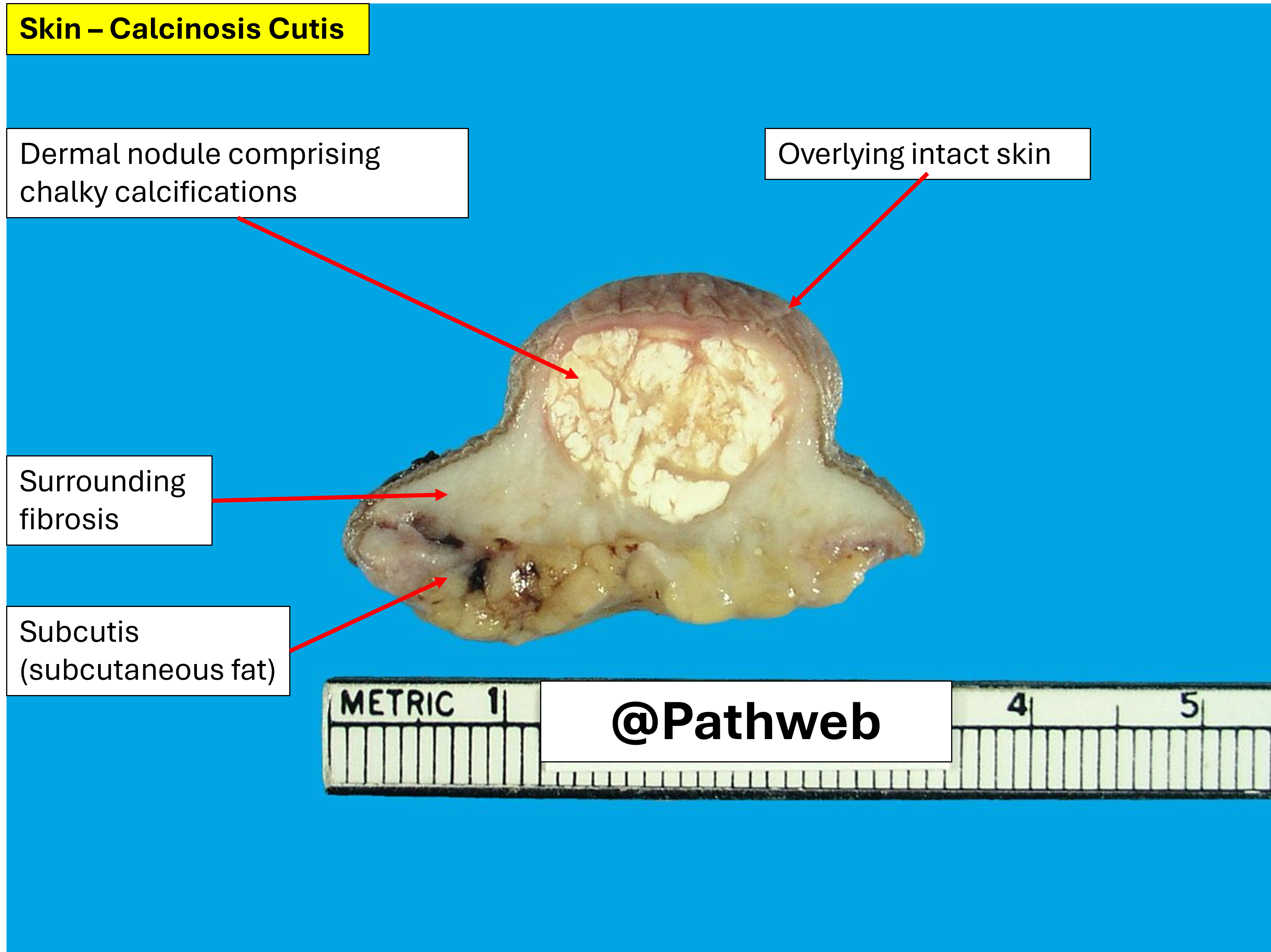 The specimen is composed of an ellipse of skin with underlying dermis and subcutis. There are well-circumscribed nodular chalky white calcified deposits within the superficial to mid-dermis. The origin of these calcifications is variable; they may arise from dystrophic calcifications, metastatic calcifications or calcifications in a pre-existing adnexal lesion e.g. cutaneous cyst