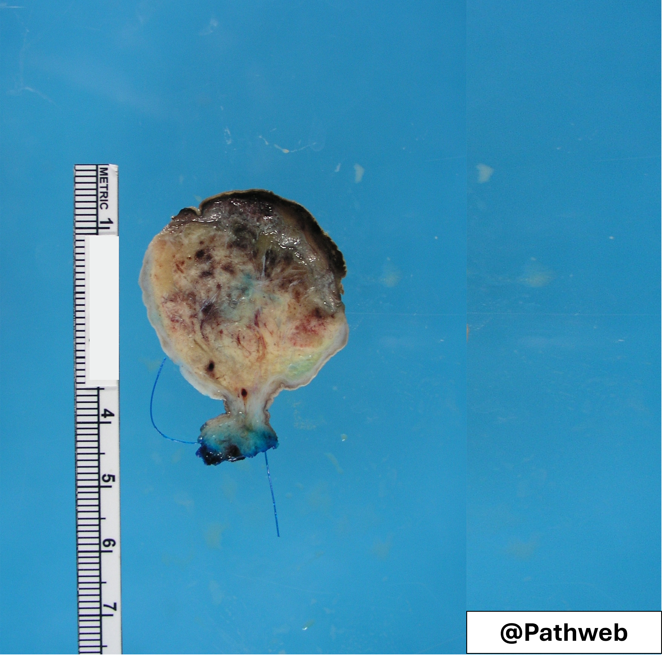 There is a polypoid nodule covered by intact skin, with a pale tan cut surface. In the fresh specimen, the cut surface may appear whitish due to the presence of fibrous tissue