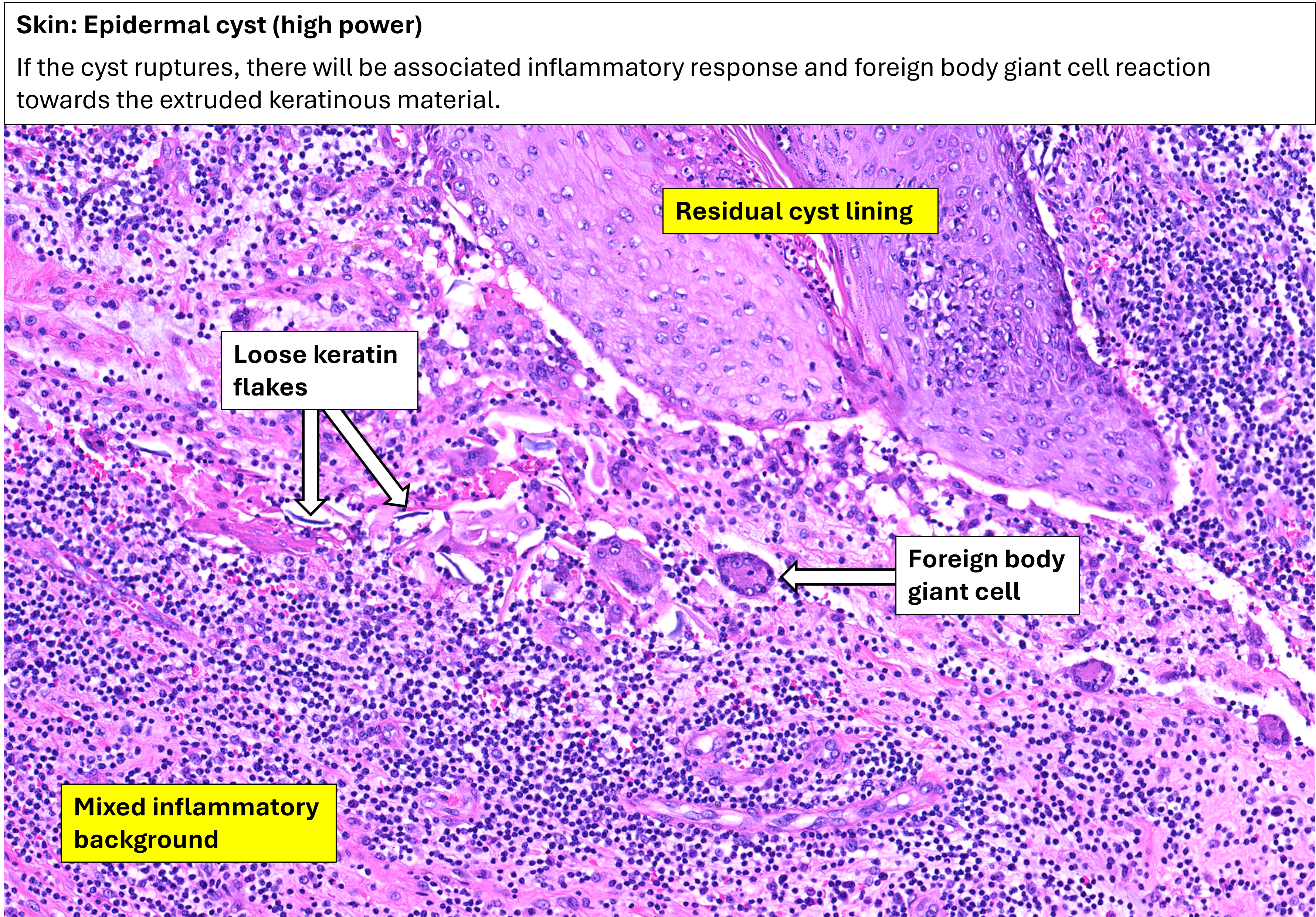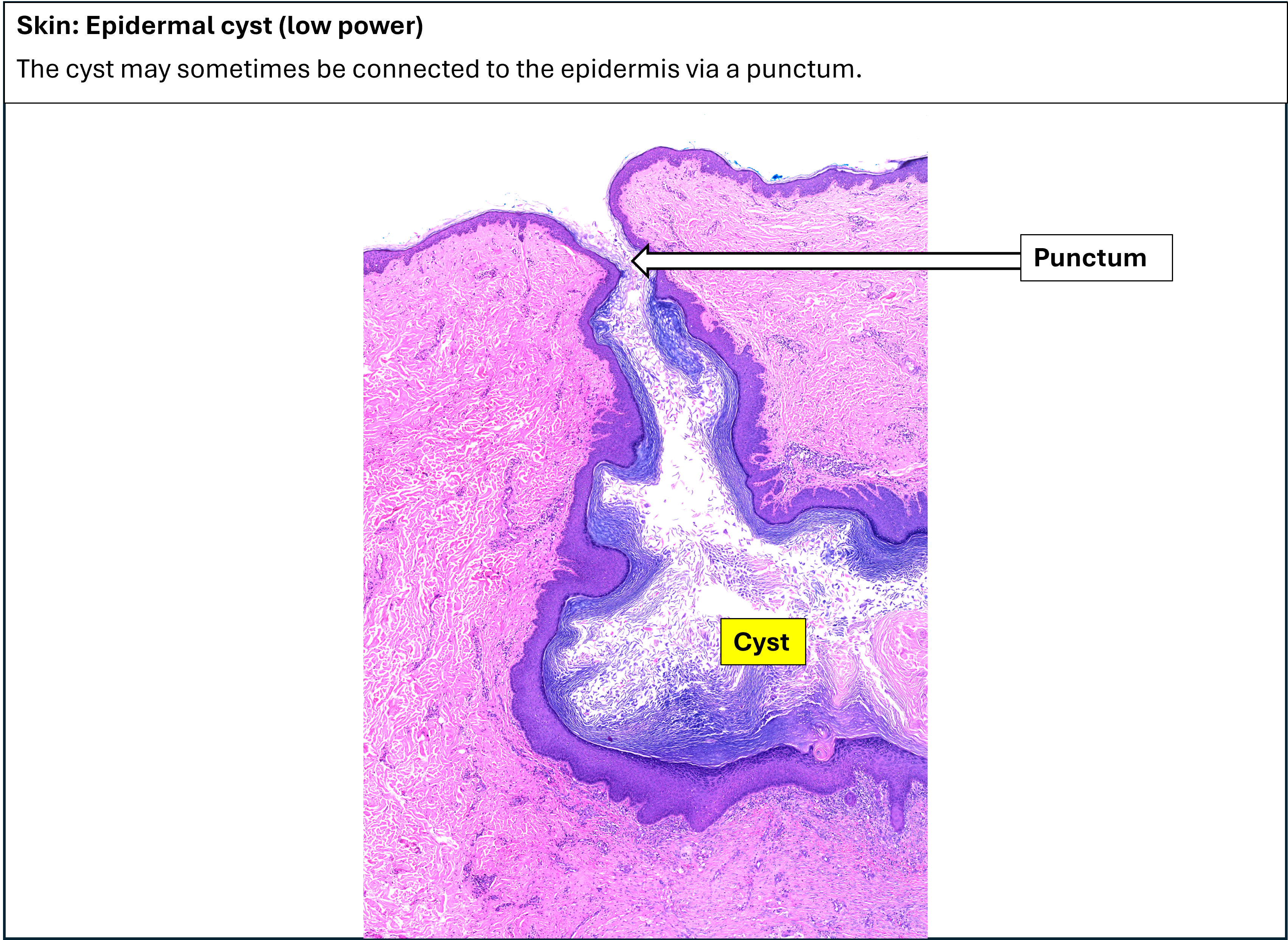 Epidermal cysts are also known as epidermal inclusion cysts. There is a unilocular cyst within the dermis, just deep to the overlying epidermis. The cyst appears to be empty, but in the fresh specimen it would have contained flaky/pulpy grey-white contents, which, on microscopy, corresponds to keratinous material