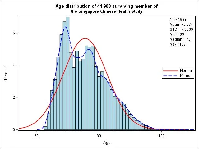 As of record linkage analysis with databases of the Singapore National Birth and Death Registry in 2016, 21,213 (33.5%) of the 63,257 original cohort members died, and 56 subjects were known to be lost to follow-up due to migration out of Singapore. Thus 41,988 (66.4%) original cohort participants were alive as of 12/31/2016. The mean age was 75.6 years (SD 7.0) with a range from 63 to 107 years (Figure 1).