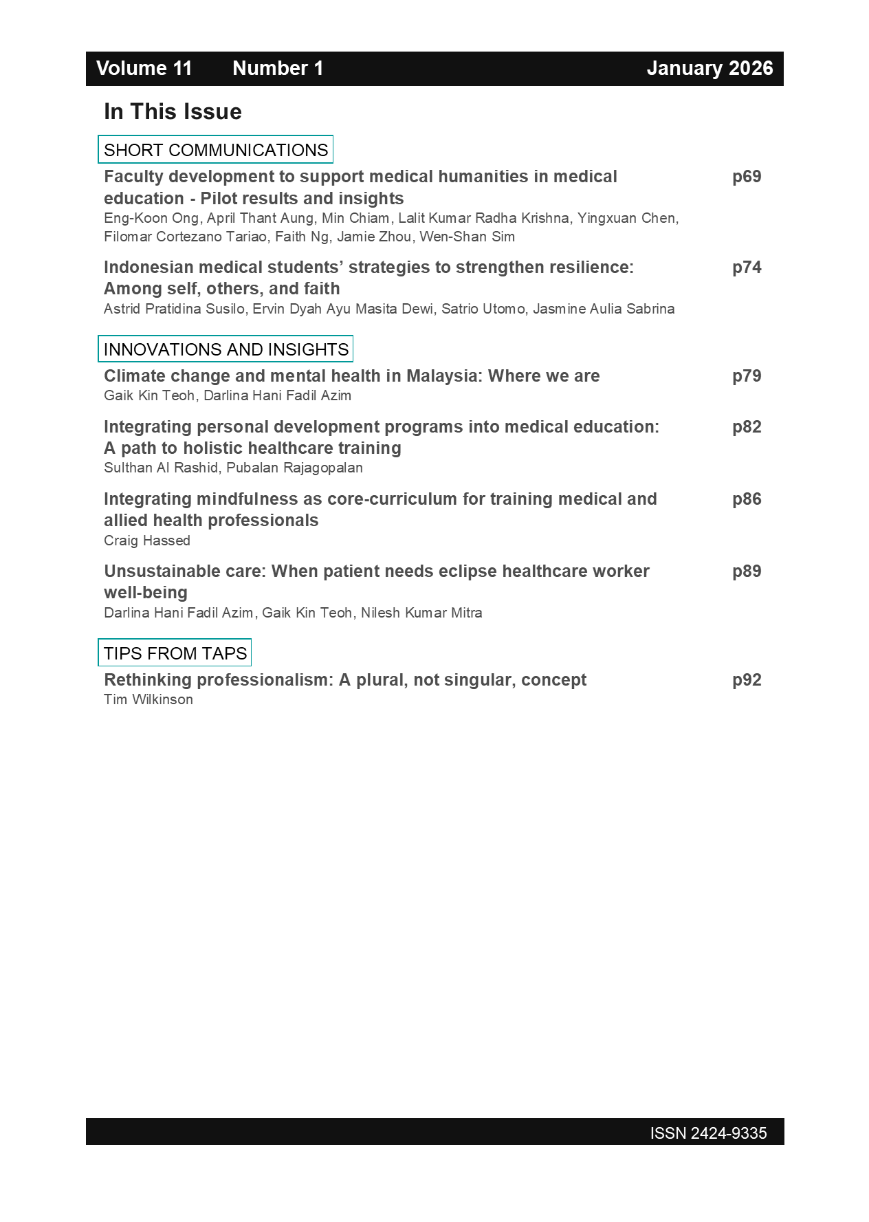 We are delighted to present this fourth thematic issue of The Asia Pacific Scholar (TAPS) on Developing a Holistic Healthcare Practitioner for a Sustainable Future. This issue encapsulates a wealth of contributions from authors across regions and disciplines, reflecting the shared agency in addressing the changing landscape of healthcare. Authors were invited to explore how sustainability, inclusivity, and innovation could be interwoven into the formation of the modern practitioner. In response, 14 thought-provoking papers were submitted and accepted. These papers explored the vital shift from siloed clinical training toward education that integrates empathy, well-being, interprofessional collaboration, and environmental consciousness.