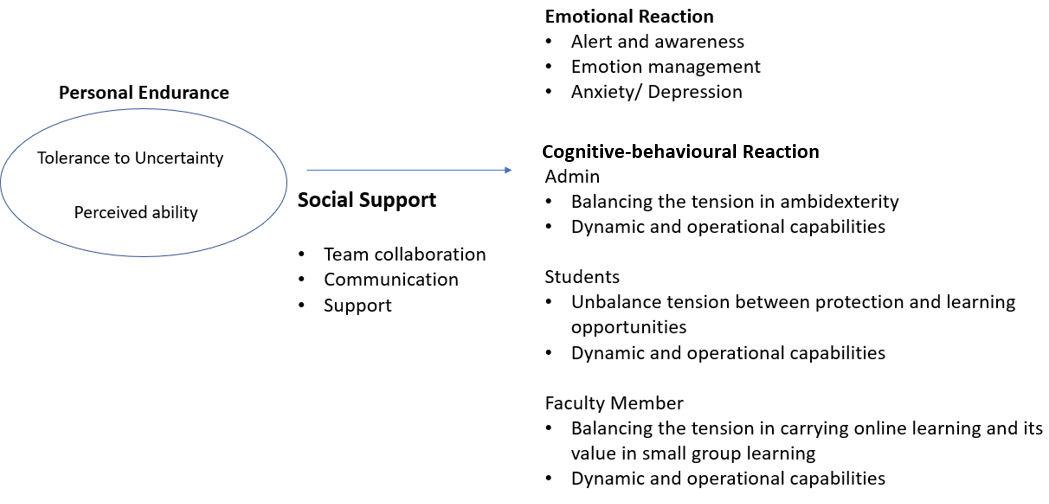 Personal endurance depends on perceived ability and tolerance to uncertainty. For administrators, they felt that it was quite stressful and frustrated during the pandemic as the situation was unclear. However, they were able to manage and there was a sense of relief after they had gone through the critical phase.