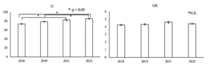 First, we compared the year-to-year results of the pre-CC OSCE in the medical interview area. Table 1 and Figure 1 shows a statistical summary of the pre-CC OSCE scores in 2022, 2021, 2019, and 2018. The results of non-parametric tests revealed that the p-values in the IS between 2022 and 2019, 2022 and 2018, and 2021 and 2018 were below 0.05, whereas no significant difference was observed in the GS.