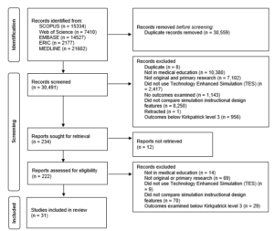 Studies were included if they were original research articles examining instructional design variations in TES with at least one outcome at Kirkpatrick levels three or above, as described and utilised by the Best Evidence Medical Education Collaboration (Steinert et al., 2006). We included a broad range of TES modalities, such as computer based virtual reality simulators, high fidelity and static mannequins, plastic models, live animals, inert animal products, and human cadavers as stipulated in the review by Cook et al. (2011). We included augmented reality and mixed reality as they satisfied the prior definition of “materials and devices created or adapted to solve practical problems” in simulation established by Cook et al (2011). Studies where TES was utilised together with human patient actors were included. We included studies with observational, experimental, and qualitative designs.