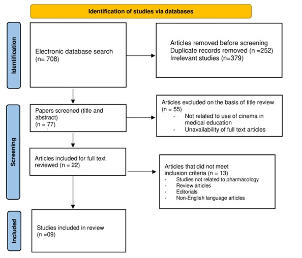 The search process is depicted in the PRISMA flow diagram (Figure 1). A total of 77 publications were found through the search method. After removing duplicates and irrelevant studies, 22 publications were selected for preliminary eligibility screening. Of these, 13 were excluded for studies not pertaining to pharmacology teaching, or absence of a cinema-based intervention, and review articles or editorials. Finally, 09 publications were included in the study after they fully satisfied the selection criteria. Every member of the study team developed a consensus to address any possible ambiguities in meeting the inclusion criteria.