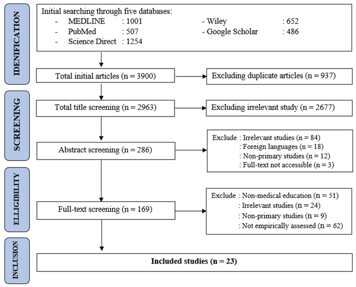 This study aims to explore the role of cinema and motion pictures in medical education. The research team reviewed and collected data aligned with the keywords in the research questions, results, and discussions of the selected publications. Quality Assessment of Diverse Studies (QuADS) technique, both authors independently assessed every study that was involved (Albert et al., 2024; Harrison, et al., 2021). This tool provides a straightforward scoring system for assessing study quality in systematic reviews. It consists of 13 items, with each study receiving a score between 0 and 3, where ‘0’ indicates no mention, ‘1’ signifies minimal detail, ‘2’ represents moderate detail, and ‘3’ denotes complete information, resulting in a maximum possible score of 39. For the purpose of this review, studies were grouped descriptively into three categories of methodological quality: low (≤17), moderate (18–28), and high (≥29). These categorisations were used solely for summarising study quality and not for excluding any studies from the review. All studies that met the inclusion criteria were retained, and the quality appraisal results were used to inform the interpretation of the findings rather than as an exclusion criterion.