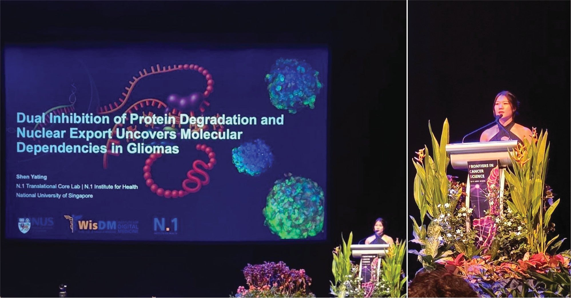 We are proud to celebrate the work of Ms. Shen Yating, a Research Assistant from the Translational Core Laboratory at WisDM/N.1, who has been shortlisted to deliver a Lightning Talk at the Frontiers in Cancer Science (FCS) 2025 conference, held from 5 to 7 November 2025. Her presentation, “Dual inhibition of protein degradation and nuclear export uncovers molecular dependencies in Gliomas,” highlights mechanistic insights into the vulnerabilities of high-grade gliomas and represents an important step toward improving therapeutic strategies for these deadly cancers. Yating’s achievement reflects her dedication and the Translational Core Lab’s ongoing commitment to advancing the understanding and treatment of cancer through rigorous and impactful science.