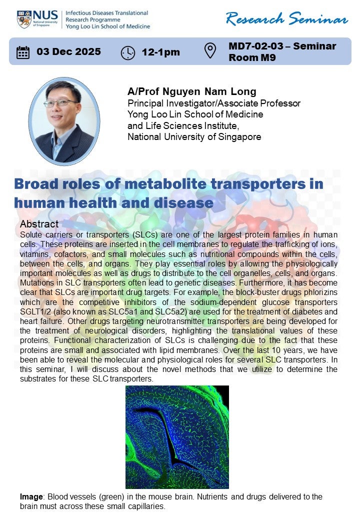 Solute carriers or transporters (SLCs) are one of the largest protein families in human cells. These proteins are inserted in the cell membranes to regulate the trafficking of ions, vitamins, cofactors, and small molecules such as nutritional compounds within the cells, between the cells, and organs. They play essential roles by allowing the physiologically important molecules as well as drugs to distribute to the cell organelles, cells, and organs. Mutations in SLC transporters often lead to genetic diseases. Furthermore, it has become clear that SLCs are important drug targets. For example, the block-buster drugs phlorizins which are the competitive inhibitors of the sodium-dependent glucose transporters SGLT1/2 (also known as SLC5a1 and SLC5a2) are used for the treatment of diabetes and heart failure. Other drugs targeting neurotransmitter transporters are being developed for the treatment of neurological disorders, highlighting the translational values of these proteins. Functional characterization of SLCs is challenging due to the fact that these proteins are small and associated with lipid membranes. Over the last 10 years, we have been able to reveal the molecular and physiological roles for several SLC transporters. In this seminar, I will discuss about the novel methods that we utilize to determine the substrates for these SLC transporters.