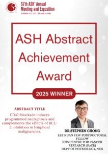 N2CR is proud to announce that our primary member, Dr Stephen Chong, has been awarded the 2025 ASH Abstract Achievement Award for his abstract titled ‘CD47‑blockade induces programmed necroptosis and complements the effects of BCL‑2 inhibition in lymphoid malignancies’. He will be presenting is abstract at the 67th ASH Annual Meeting & Exposition, taking place from December 6–9, 2025 in Orlando, Florida.