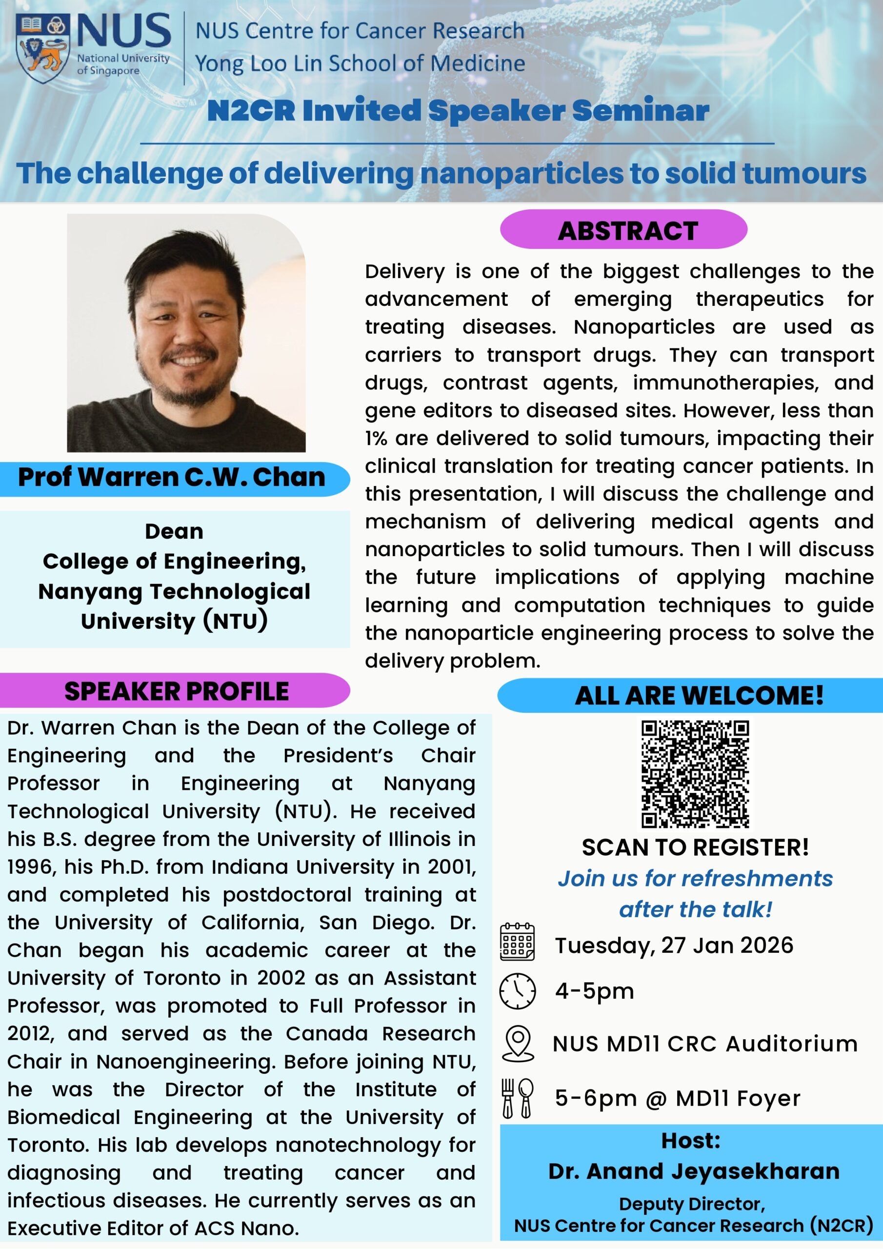 Greetings. You are cordially invited to the N2CR Invited Speaker Seminar by Professor Warren Chan, Dean, College of Engineering, NTU, on Tuesday, 27 Jan 2026 @4pm. Details of the talk are provided below.